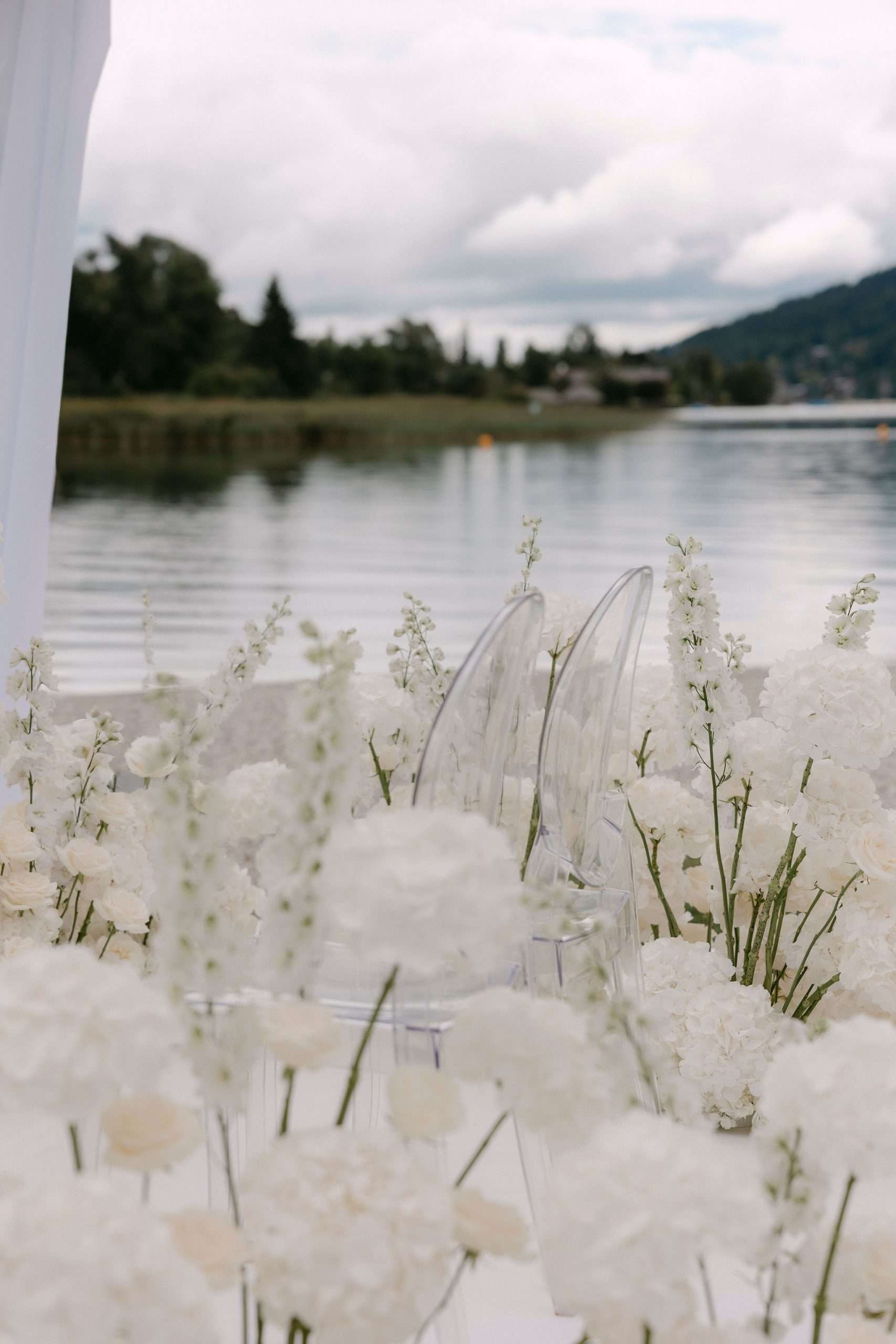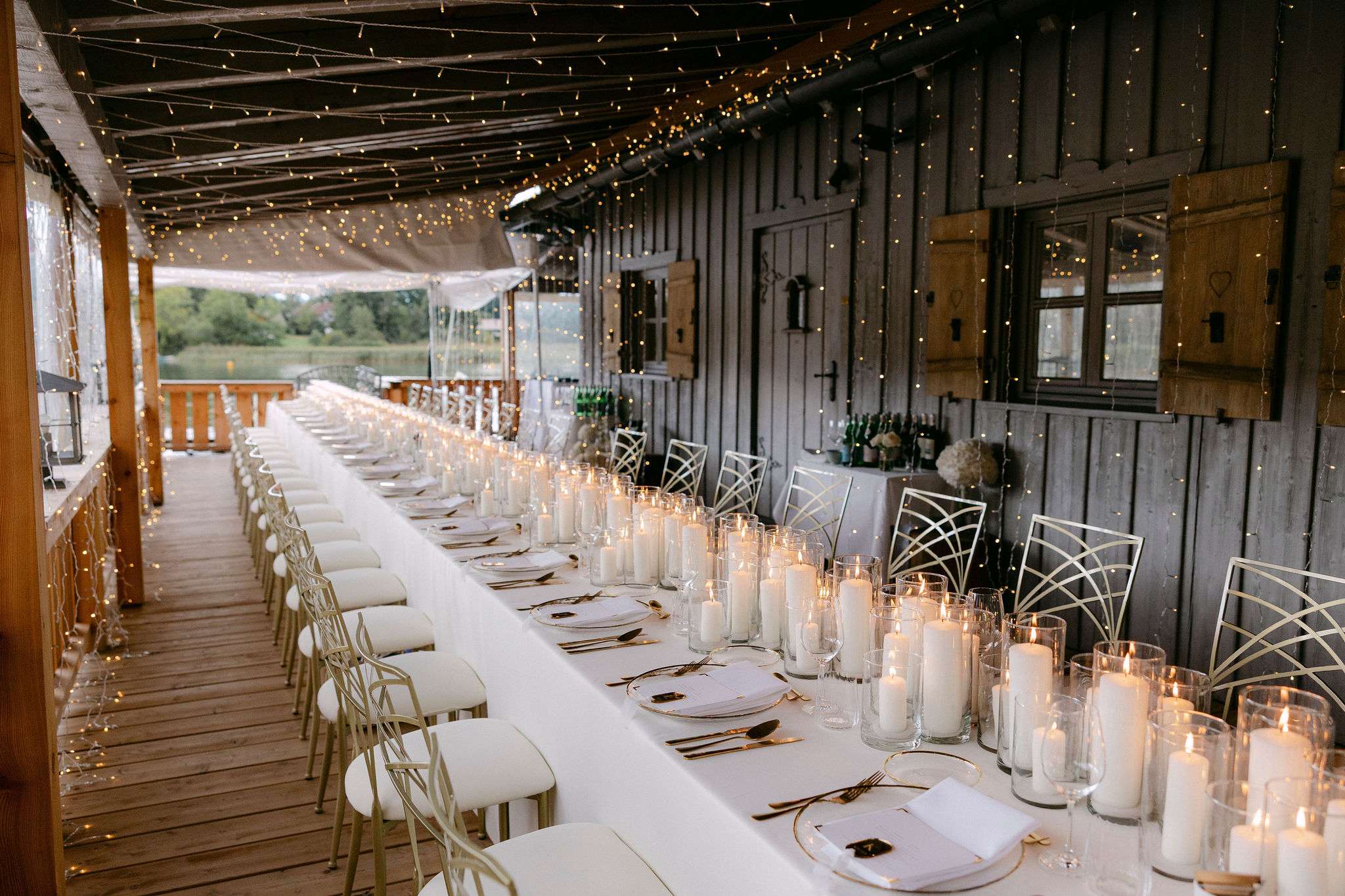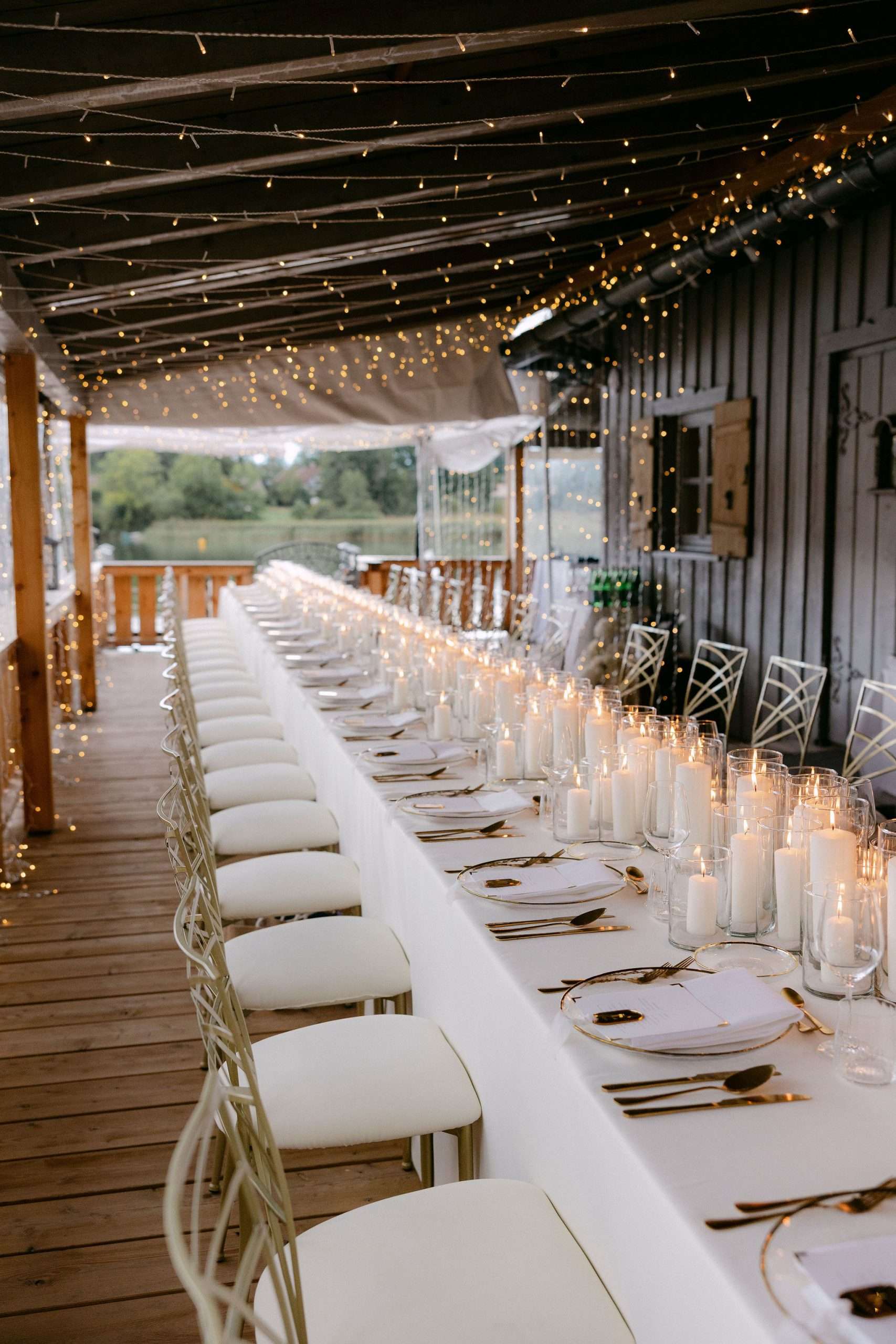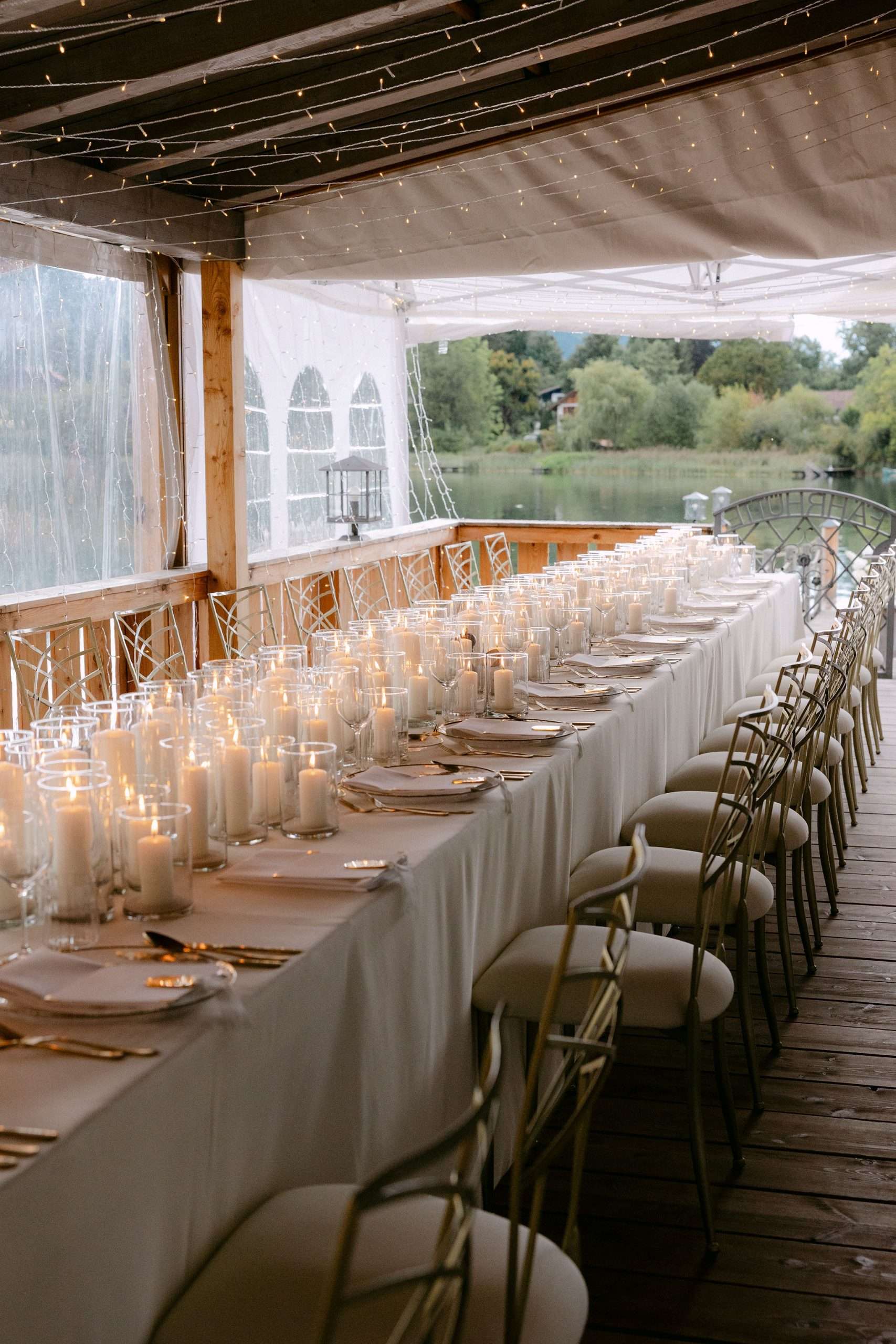 Die Inszenierung lebt von Kontrasten: filigrane Stühle, transparente Gläser und klare Linien treffen auf rustikale Holzstrukturen, Lichterketten und die natürliche Kulisse des Sees. Ob stilvolles Hochzeitsdinner unter freiem Himmel, eleganter Empfang oder freie Trauung direkt am Wasser – dieser Look eignet sich ideal für Paare, die Wert auf Understatement, Qualität und eine stimmungsvolle Gesamtwirkung legen.