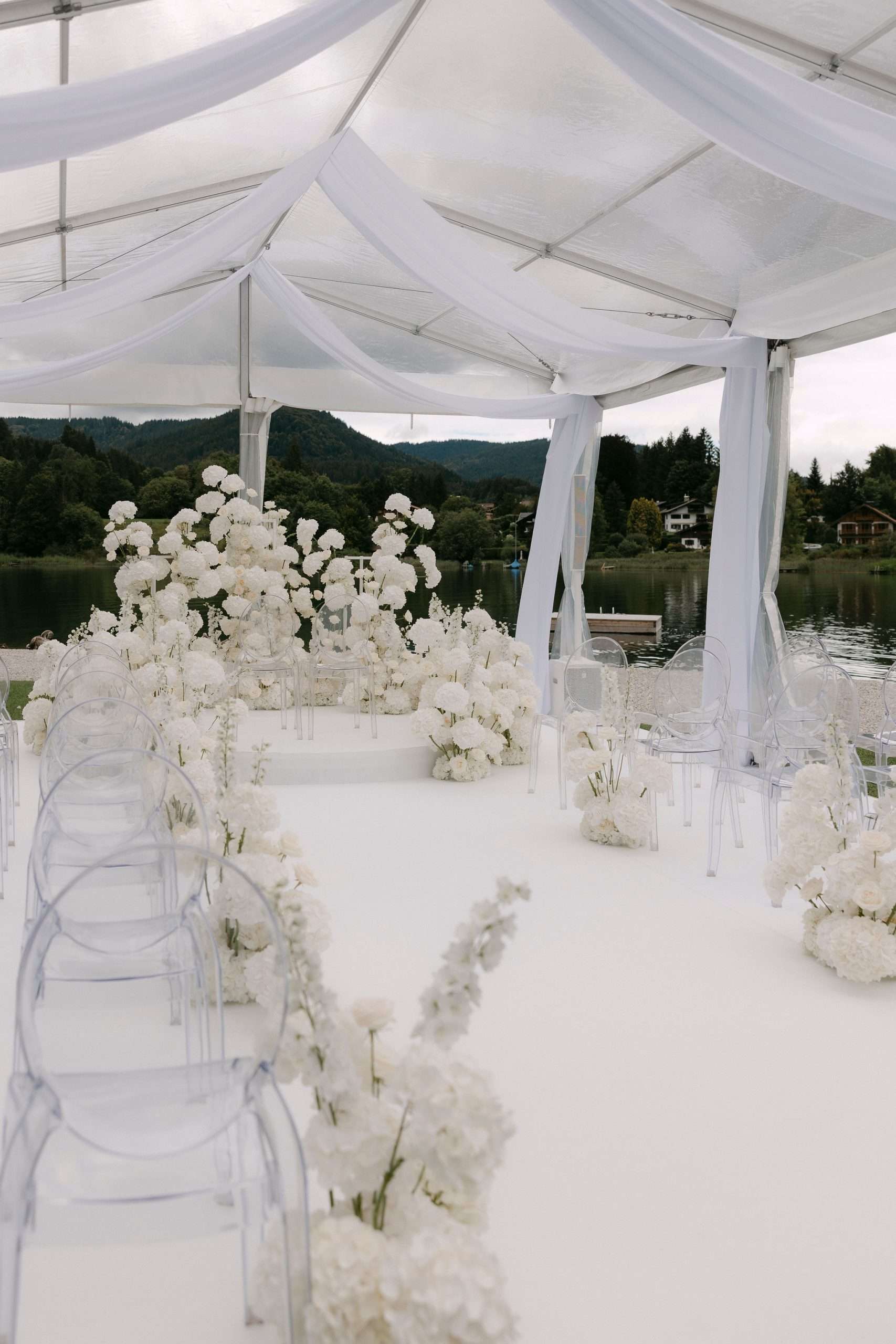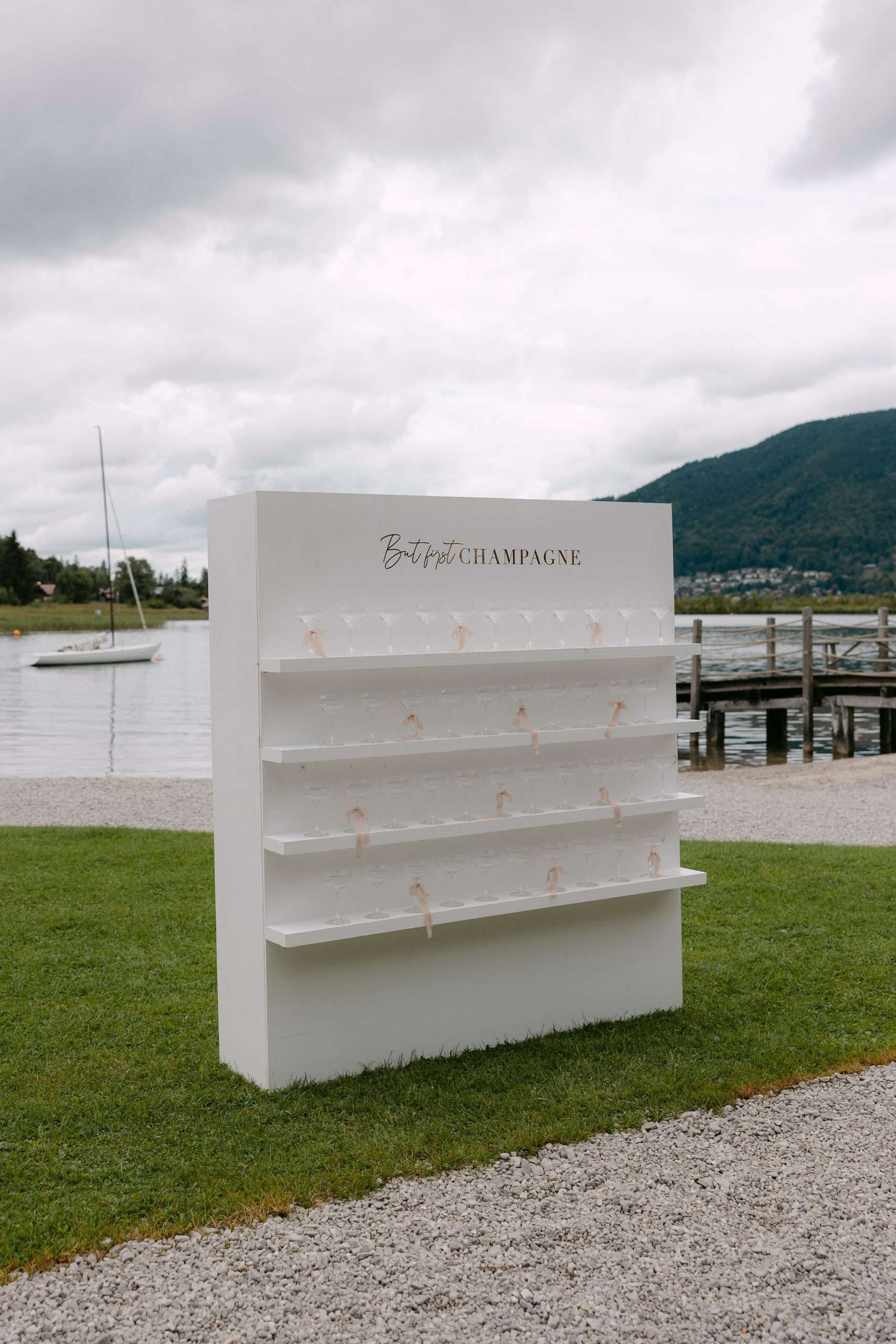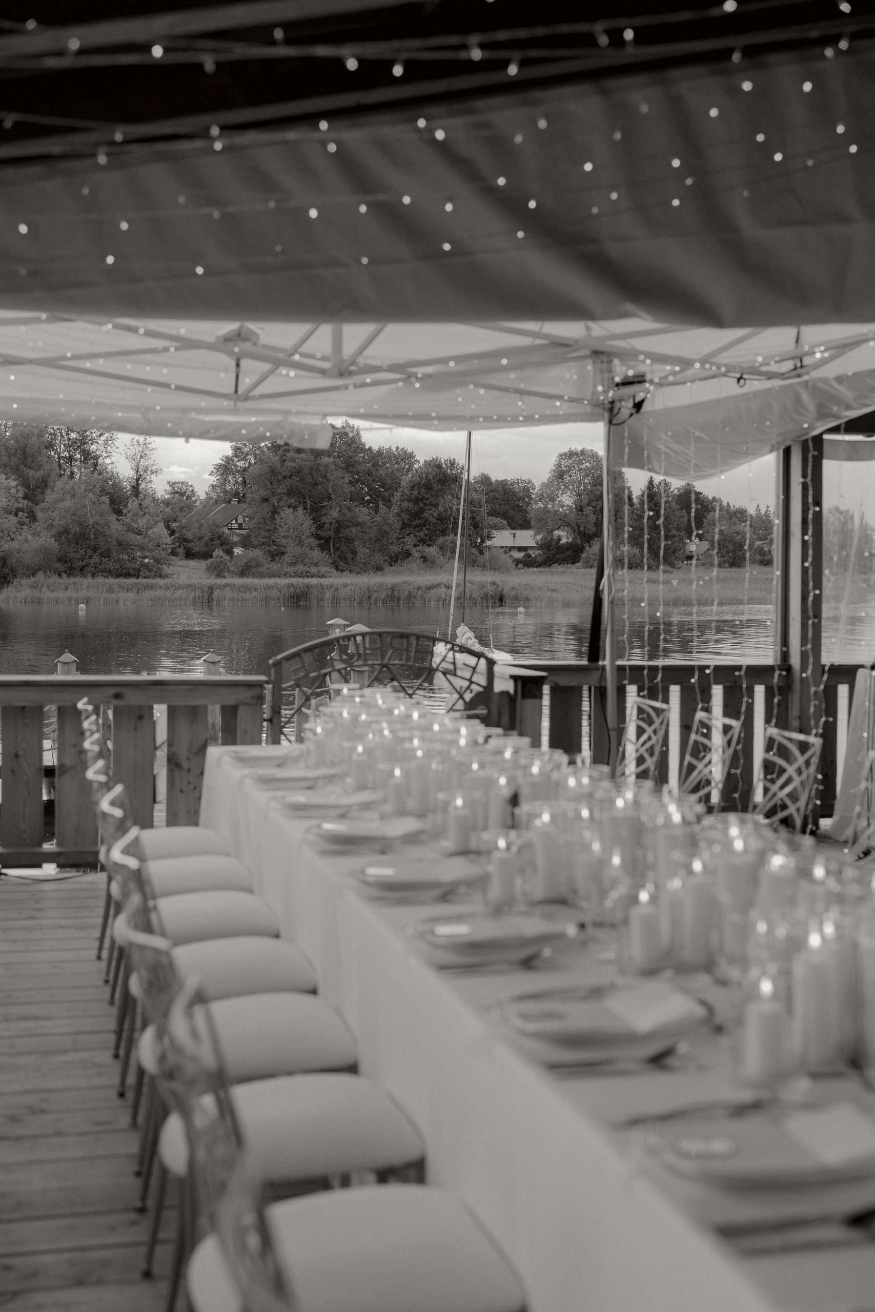 Die Inszenierung lebt von Kontrasten: filigrane Stühle, transparente Gläser und klare Linien treffen auf rustikale Holzstrukturen, Lichterketten und die natürliche Kulisse des Sees. Ob stilvolles Hochzeitsdinner unter freiem Himmel, eleganter Empfang oder freie Trauung direkt am Wasser – dieser Look eignet sich ideal für Paare, die Wert auf Understatement, Qualität und eine stimmungsvolle Gesamtwirkung legen.