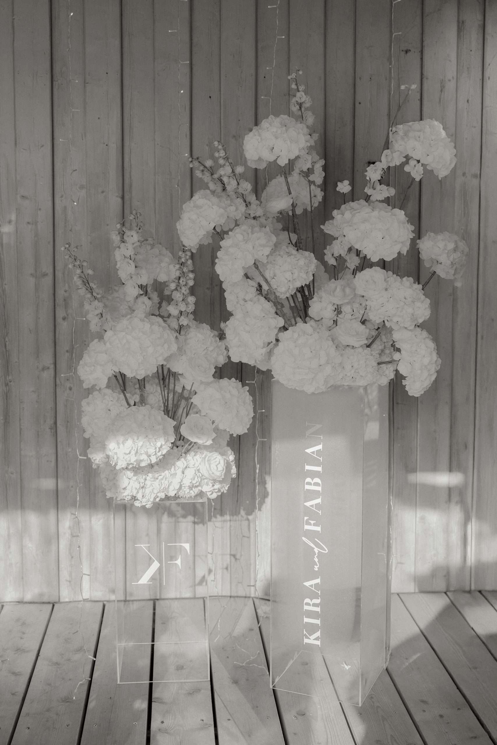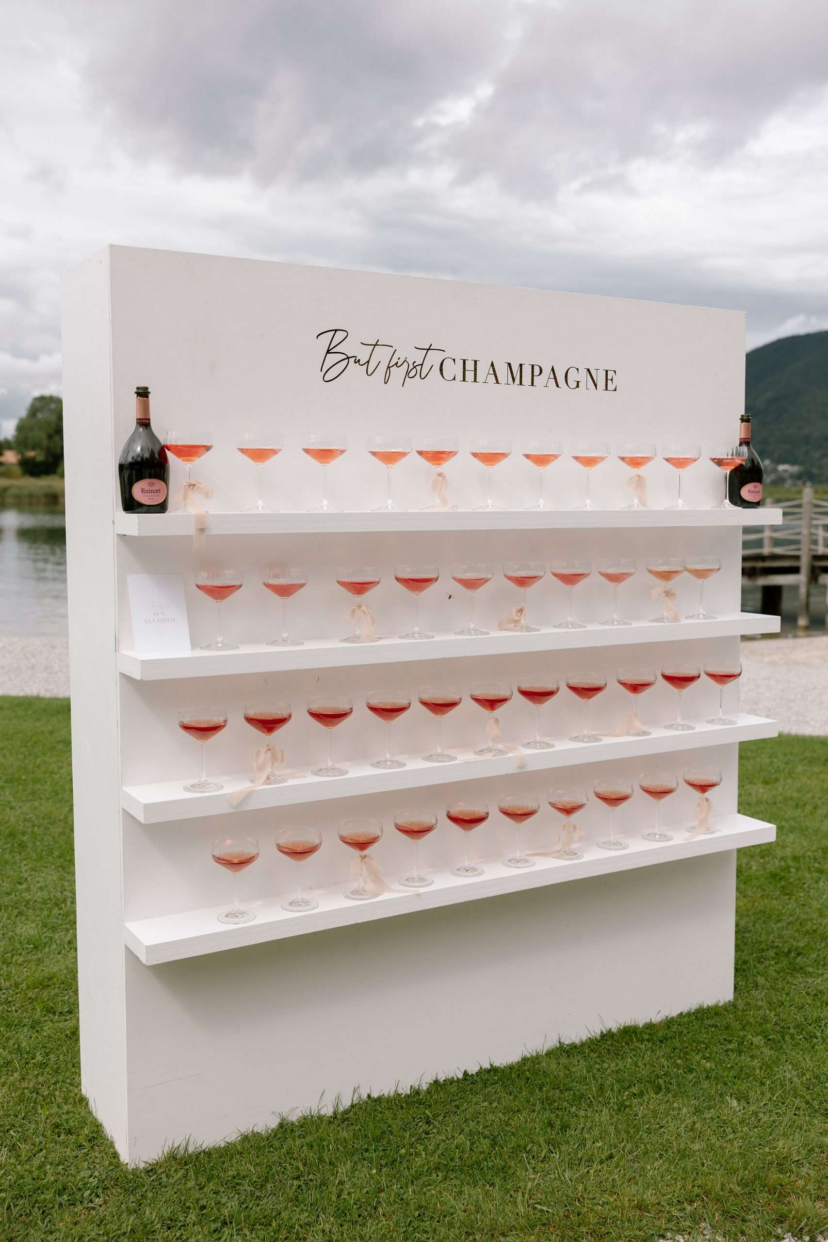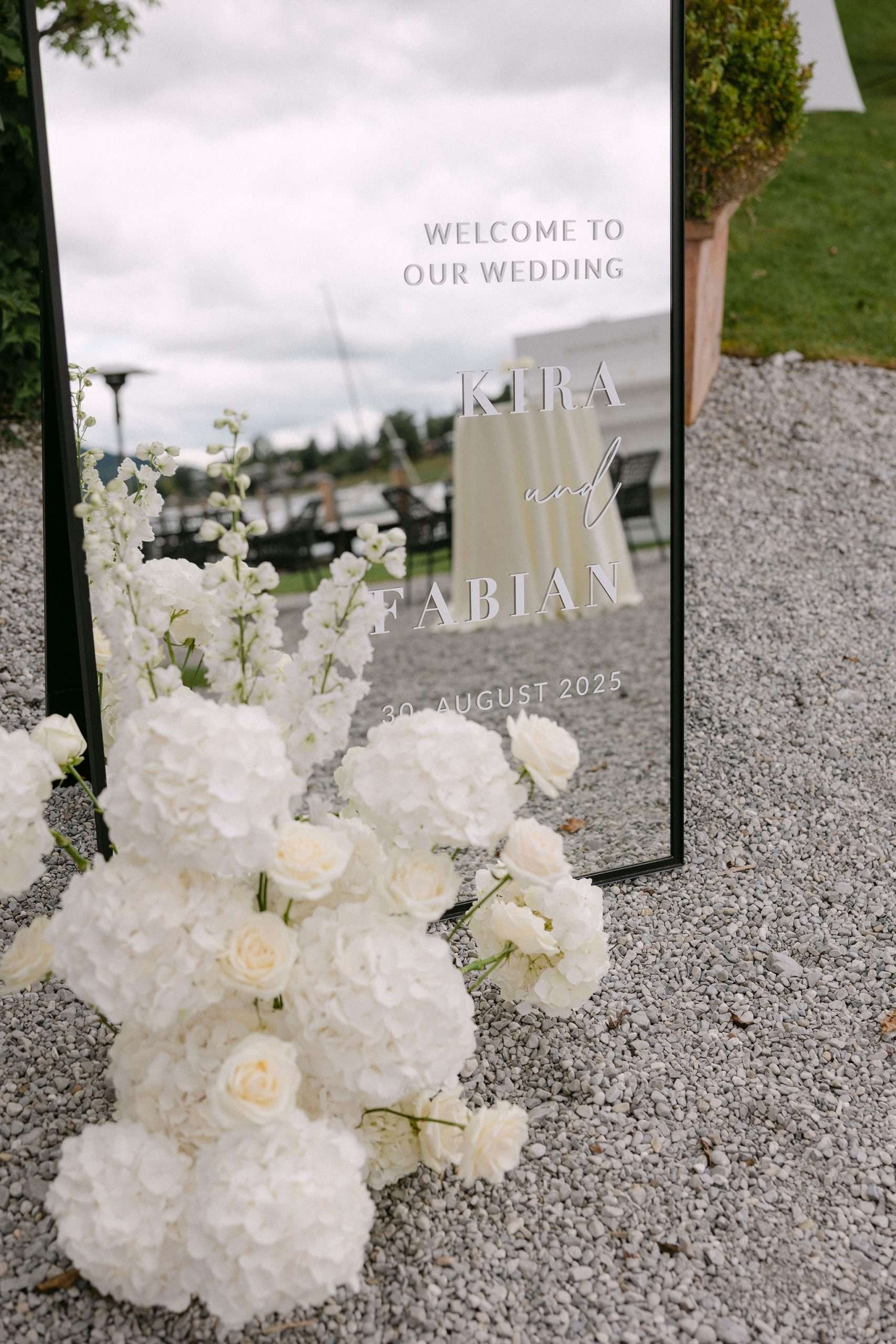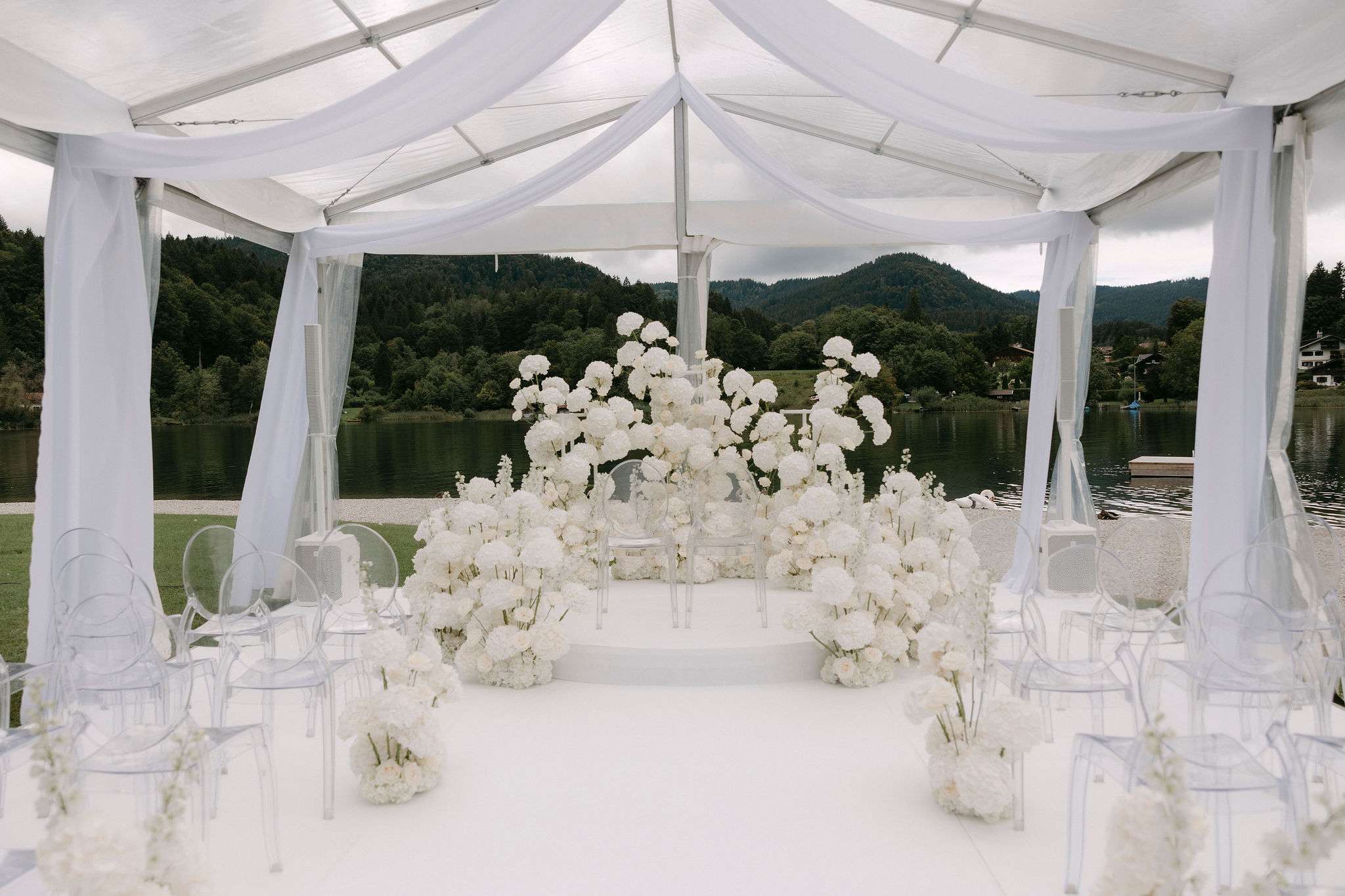 Die Inszenierung lebt von Kontrasten: filigrane Stühle, transparente Gläser und klare Linien treffen auf rustikale Holzstrukturen, Lichterketten und die natürliche Kulisse des Sees. Ob stilvolles Hochzeitsdinner unter freiem Himmel, eleganter Empfang oder freie Trauung direkt am Wasser – dieser Look eignet sich ideal für Paare, die Wert auf Understatement, Qualität und eine stimmungsvolle Gesamtwirkung legen.