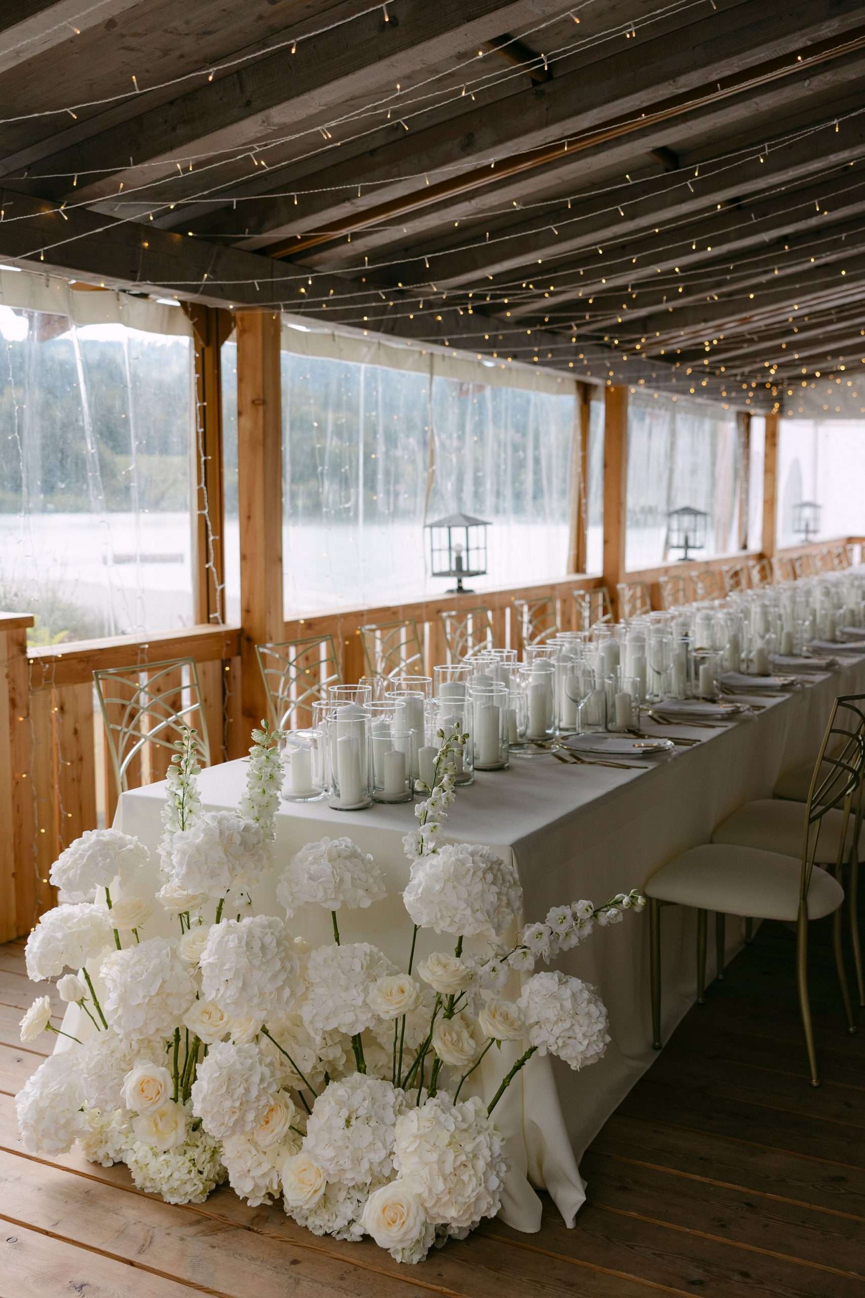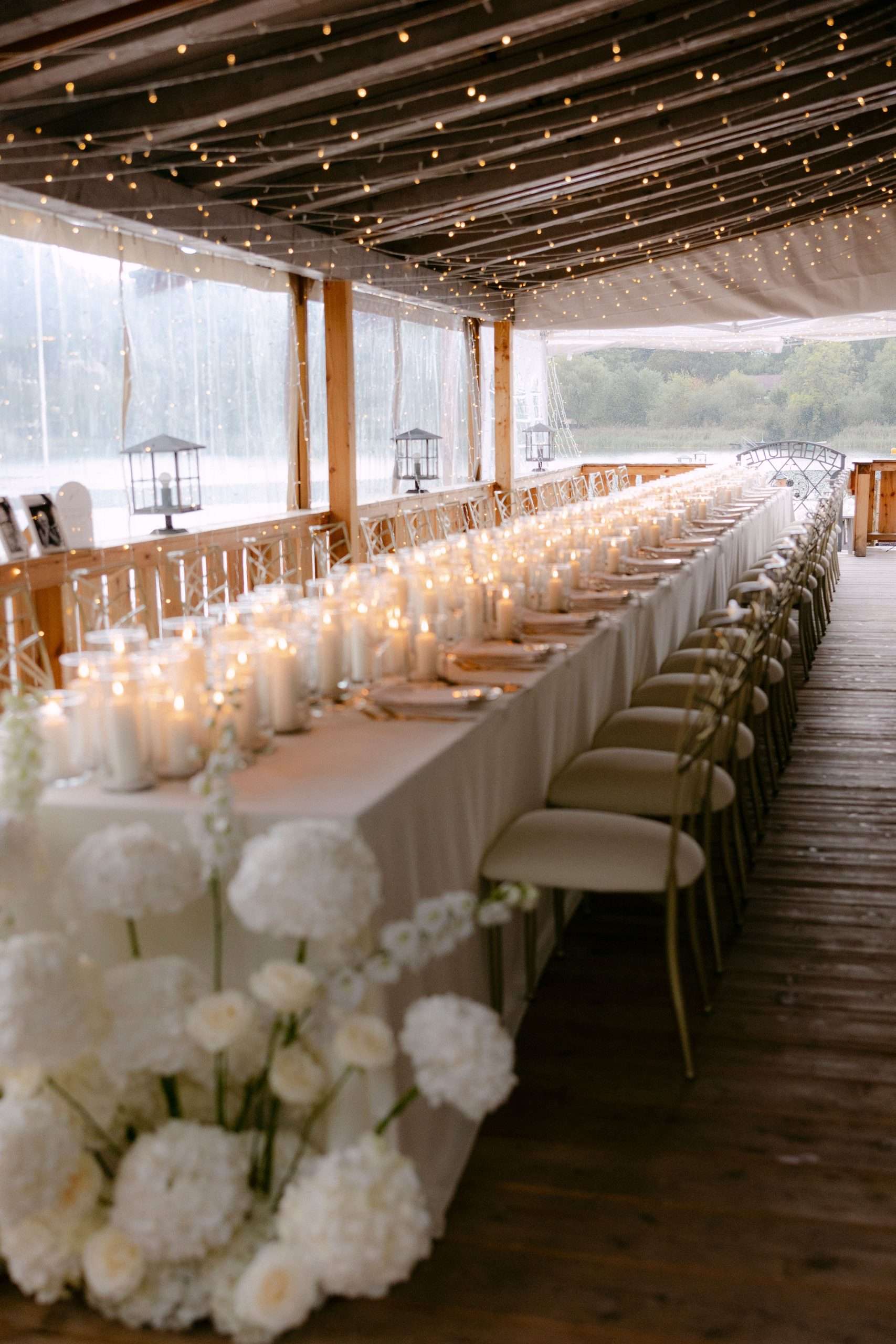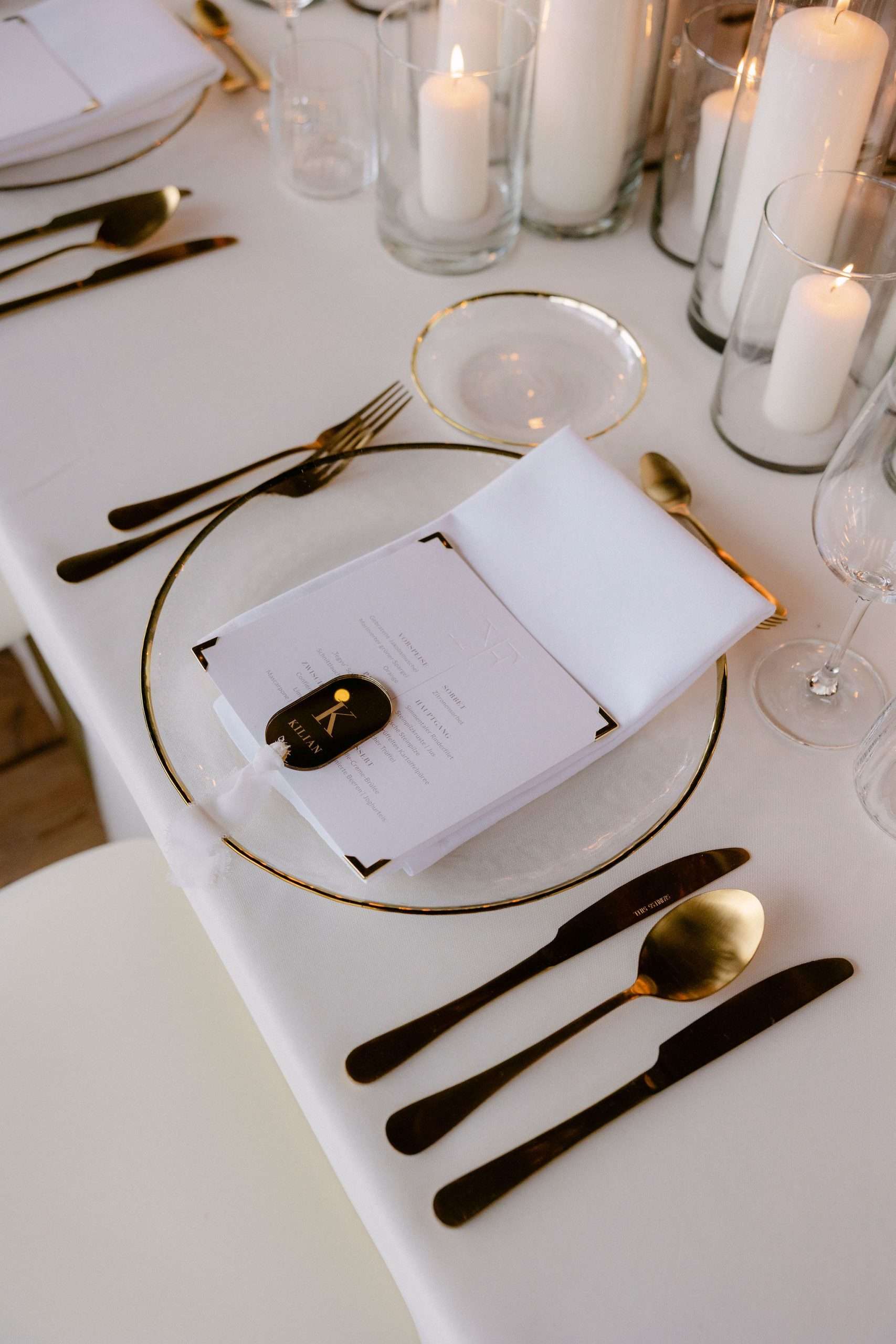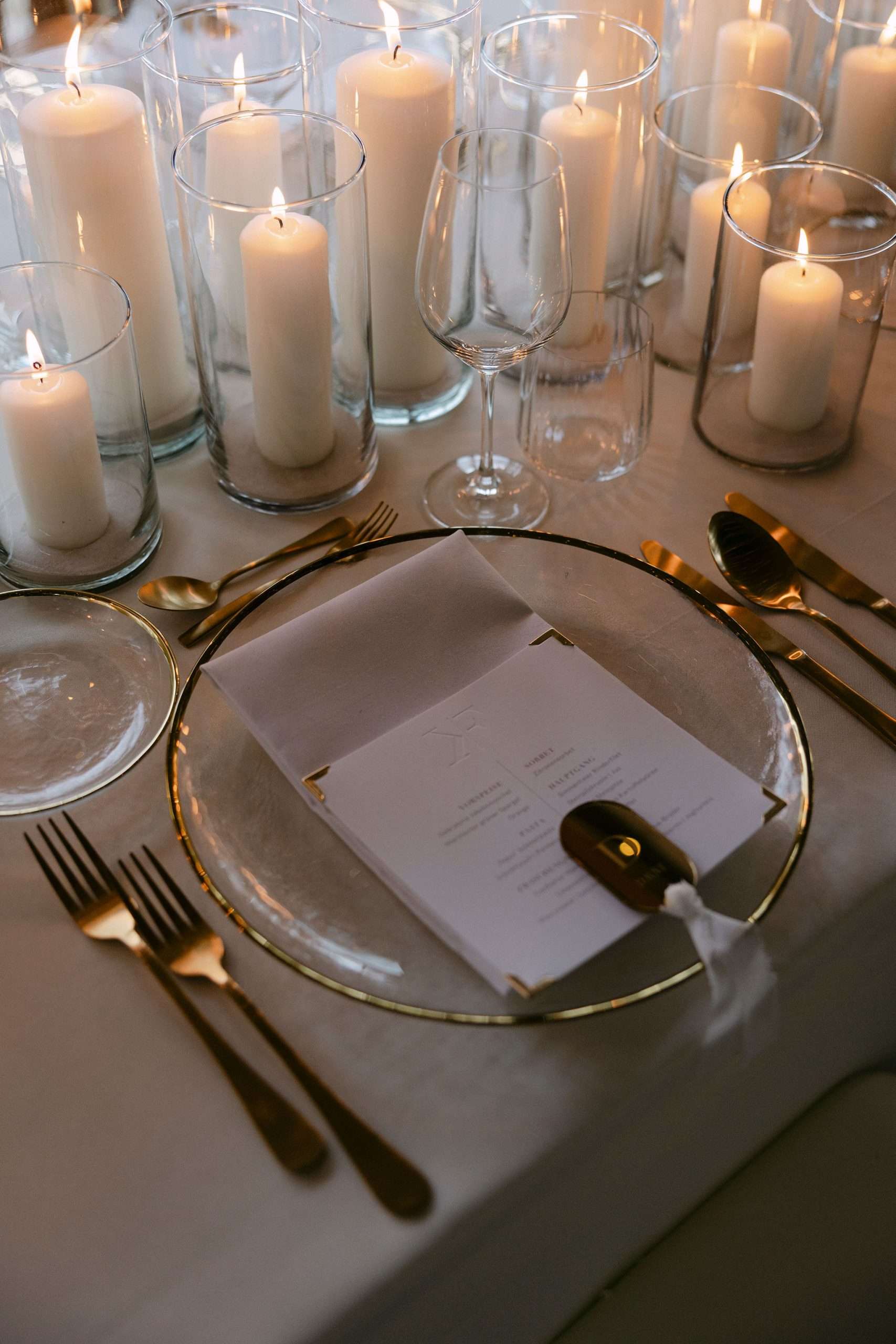 Dieser Look steht für zeitlose Eleganz, warme Lichtstimmung und eine moderne Interpretation klassischer Hochzeitsästhetik. Candlelight Elegance am Tegernsee verbindet lange, weiß eingedeckte Tafeln mit feinem Kerzenlicht, klarer Papeterie und hochwertigen Materialien. Die bewusst reduzierte Farbwelt aus Weiß, Creme und warmen Goldtönen schafft eine ruhige, harmonische Atmosphäre mit editorialem Anspruch.