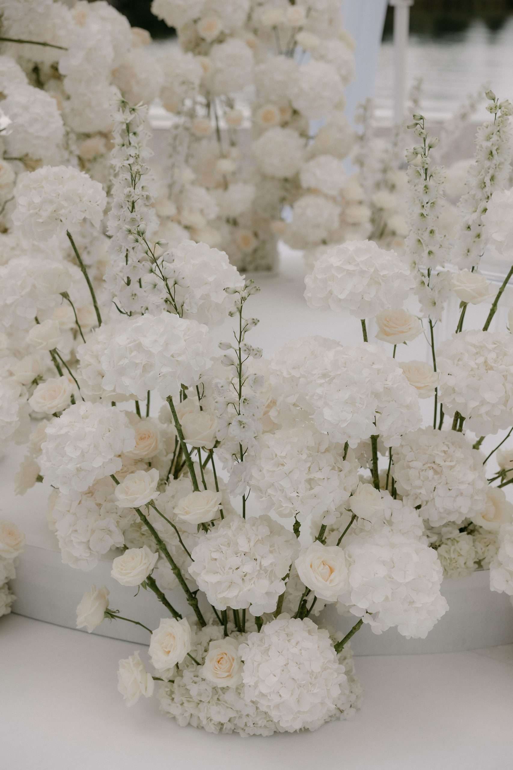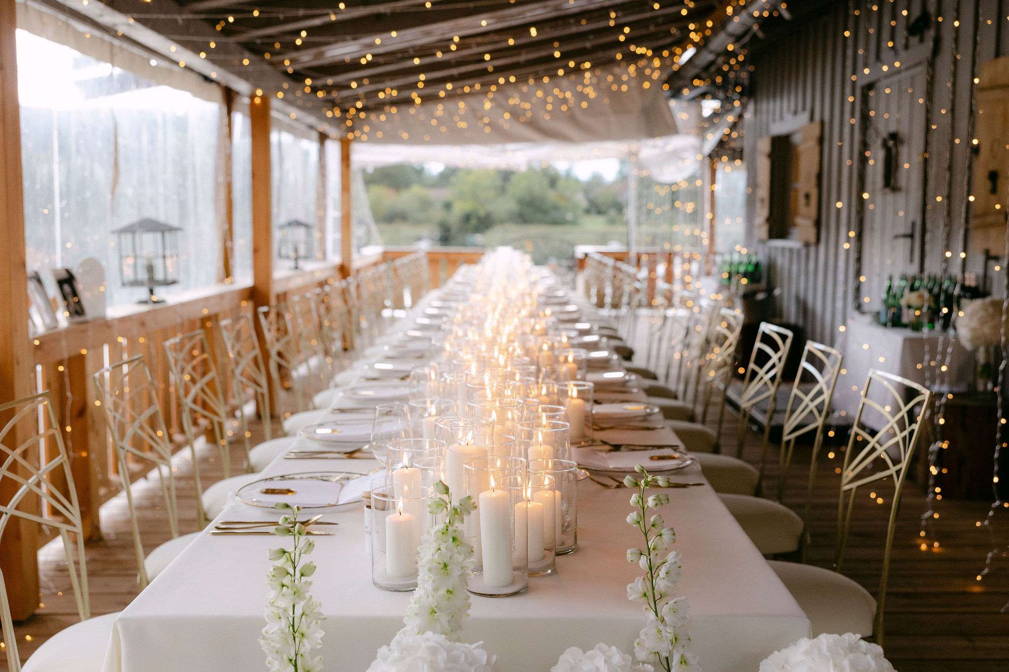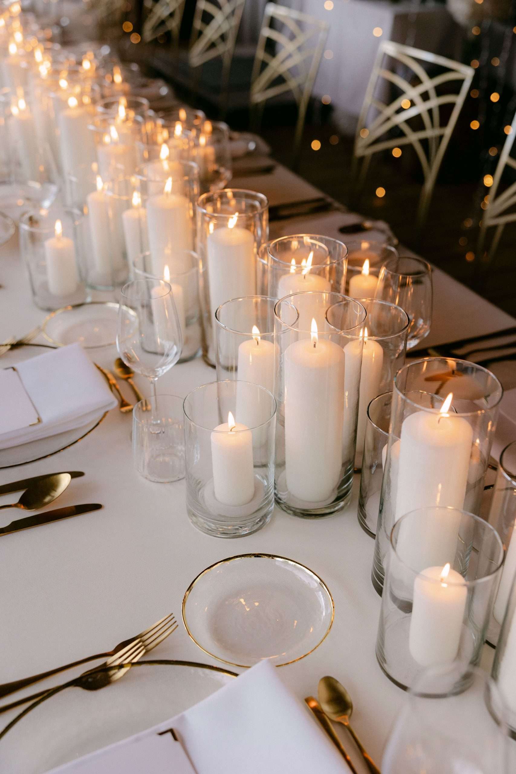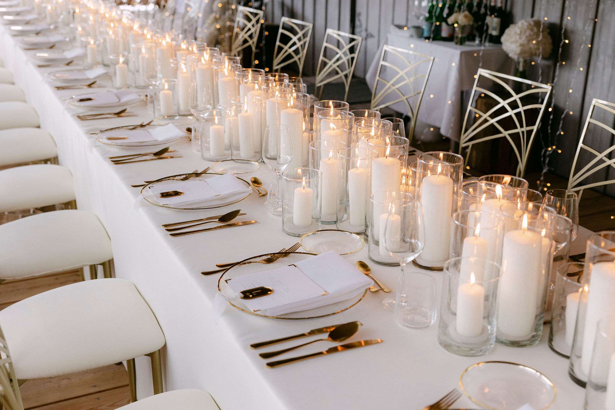 Dieser Look steht für zeitlose Eleganz, warme Lichtstimmung und eine moderne Interpretation klassischer Hochzeitsästhetik. Candlelight Elegance am Tegernsee verbindet lange, weiß eingedeckte Tafeln mit feinem Kerzenlicht, klarer Papeterie und hochwertigen Materialien. Die bewusst reduzierte Farbwelt aus Weiß, Creme und warmen Goldtönen schafft eine ruhige, harmonische Atmosphäre mit editorialem Anspruch.
