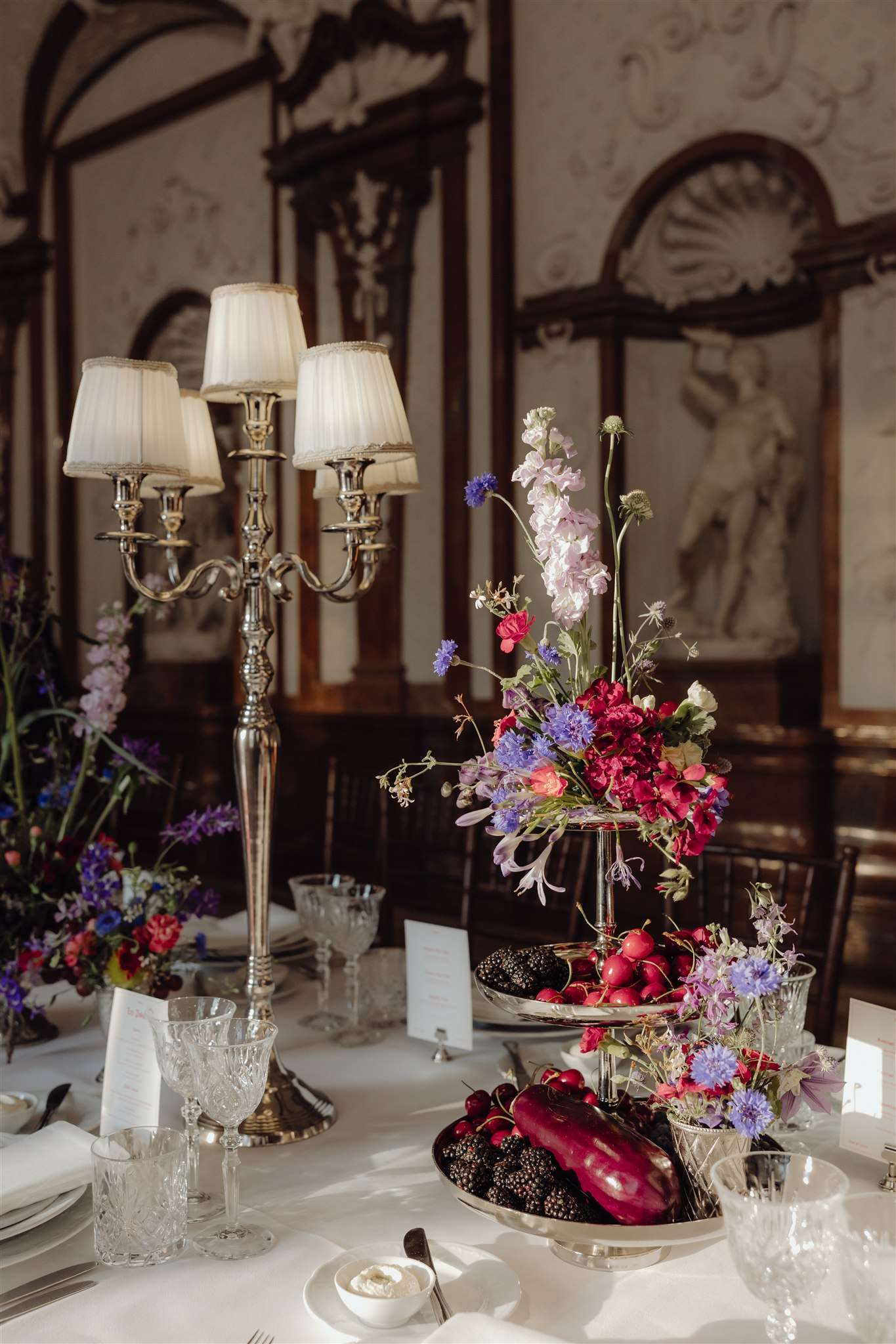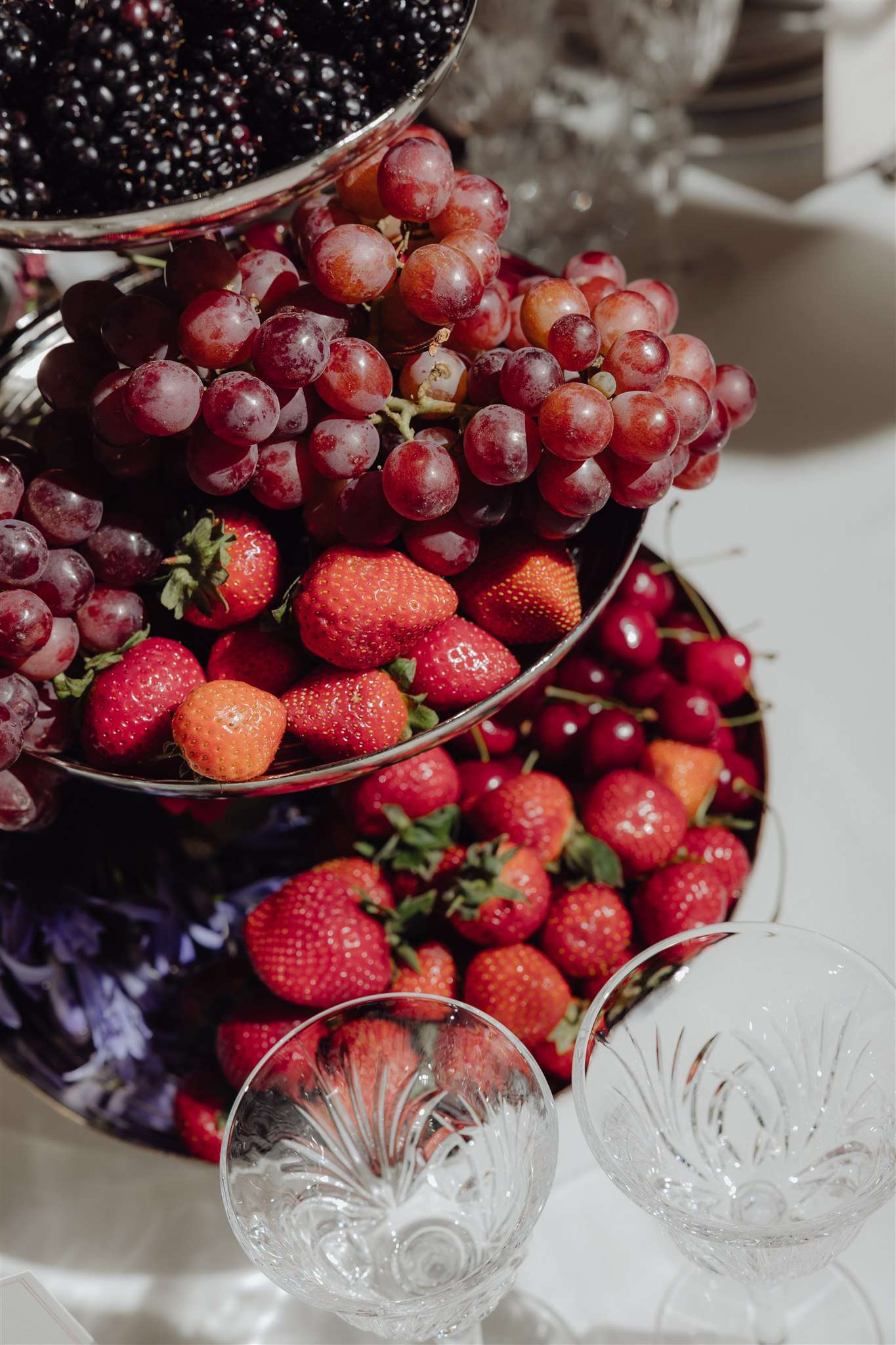 Das Farbkonzept kombinierte kräftige Beerentöne mit zarten Pastellfarben und lebendigen Blüten in Violett, Pink und Blau. Frische Früchte wie Erdbeeren, Brombeeren und Trauben ergänzten das Arrangement und gaben der Dekoration eine moderne, lebendige Note.