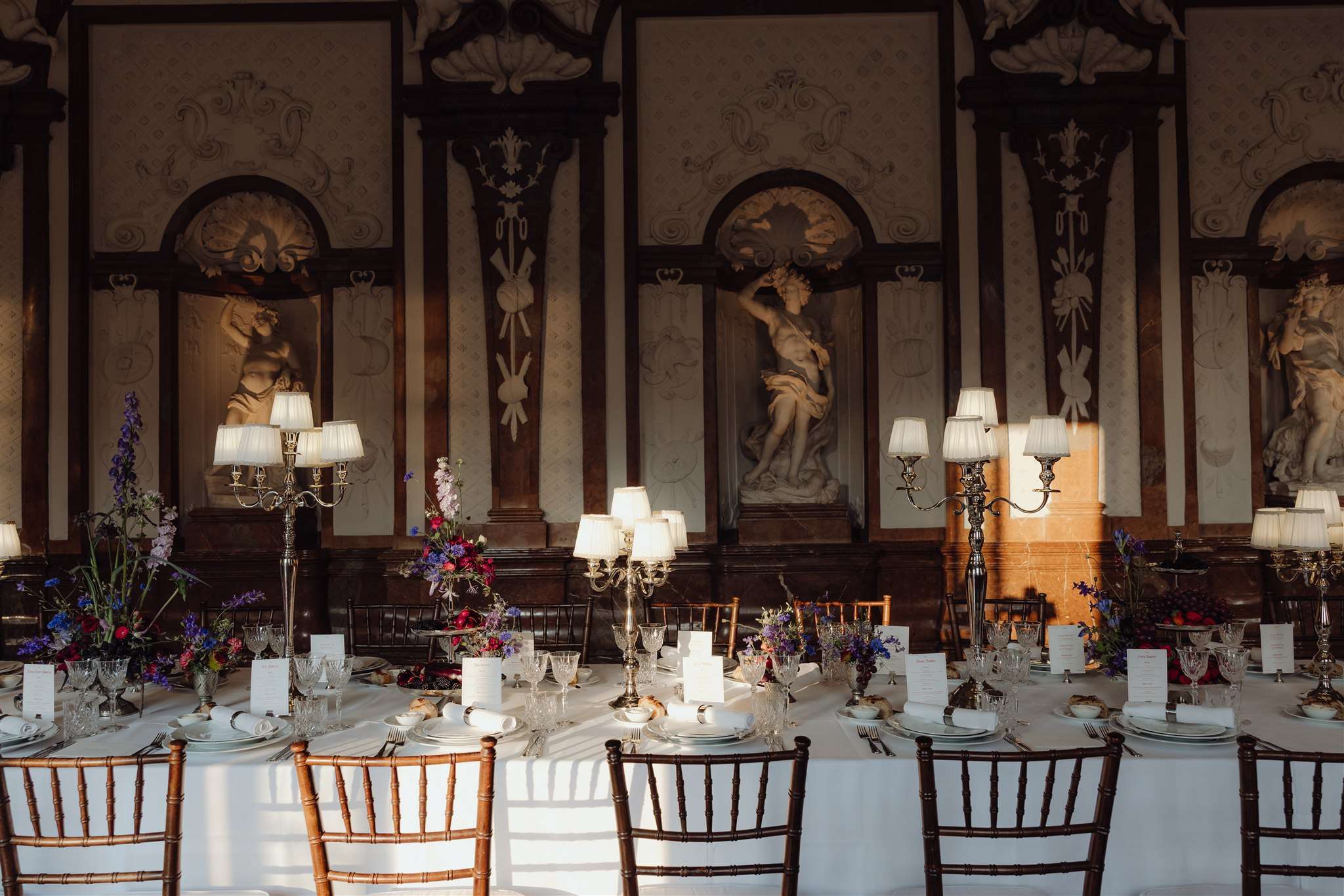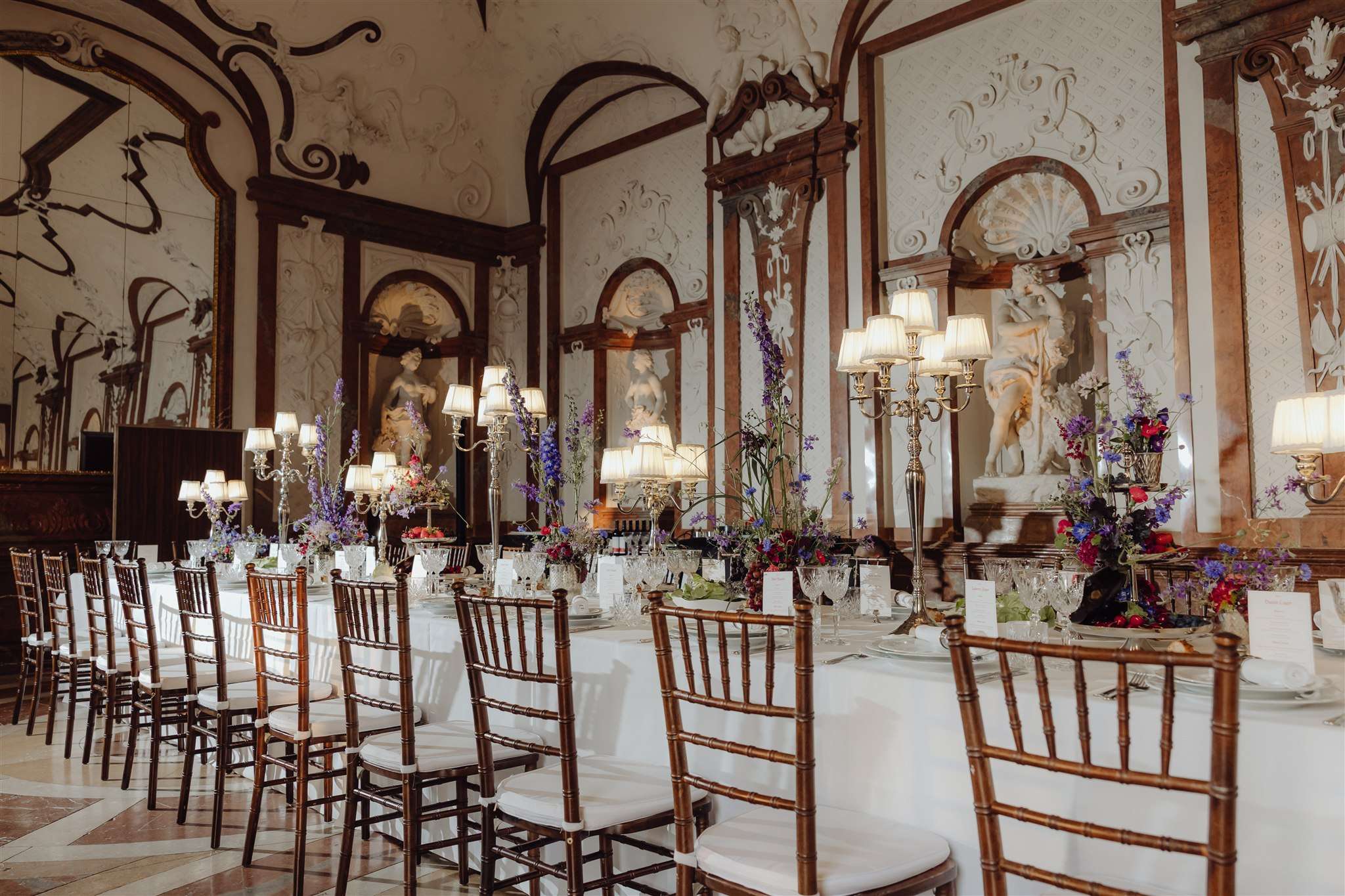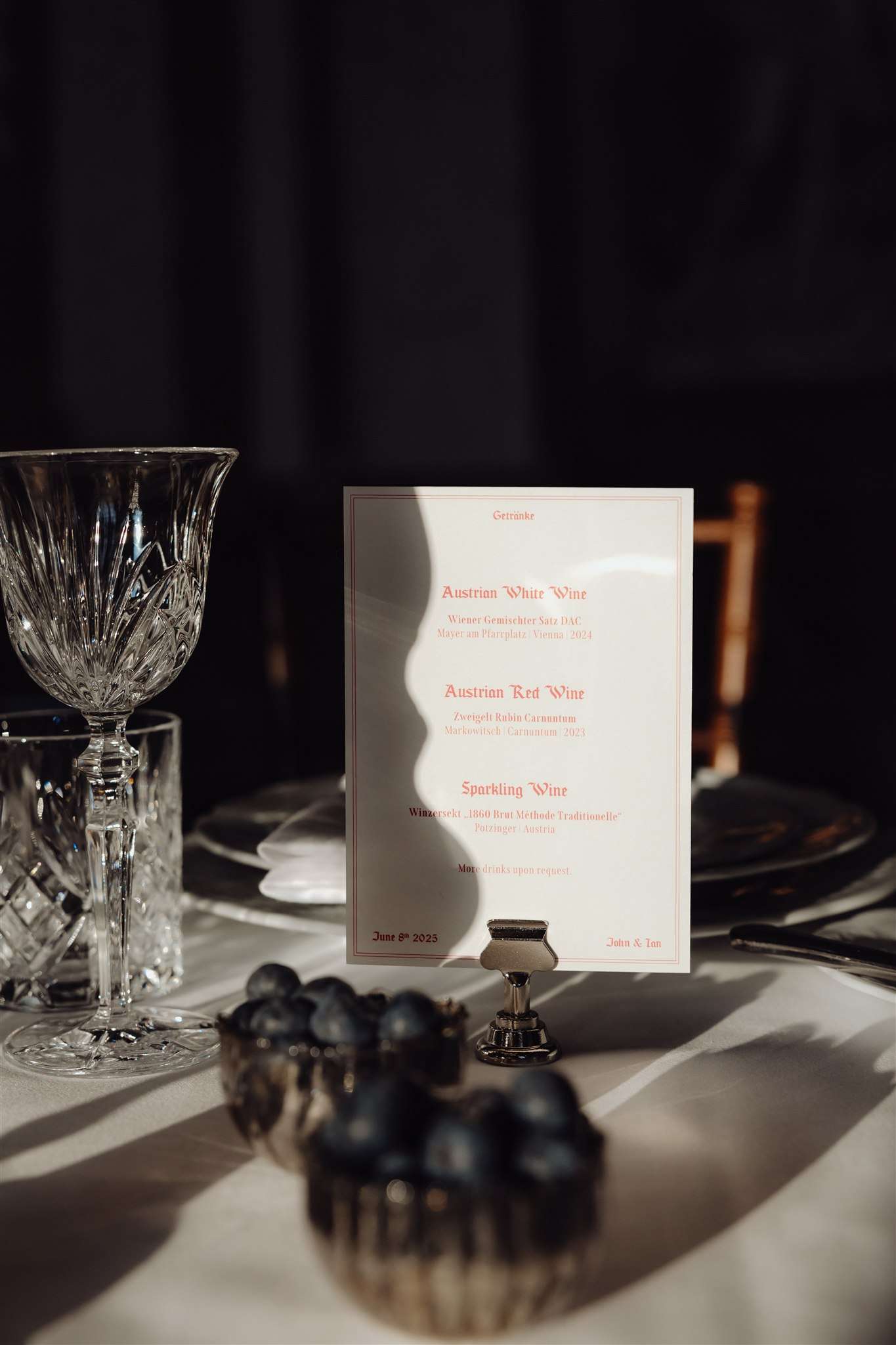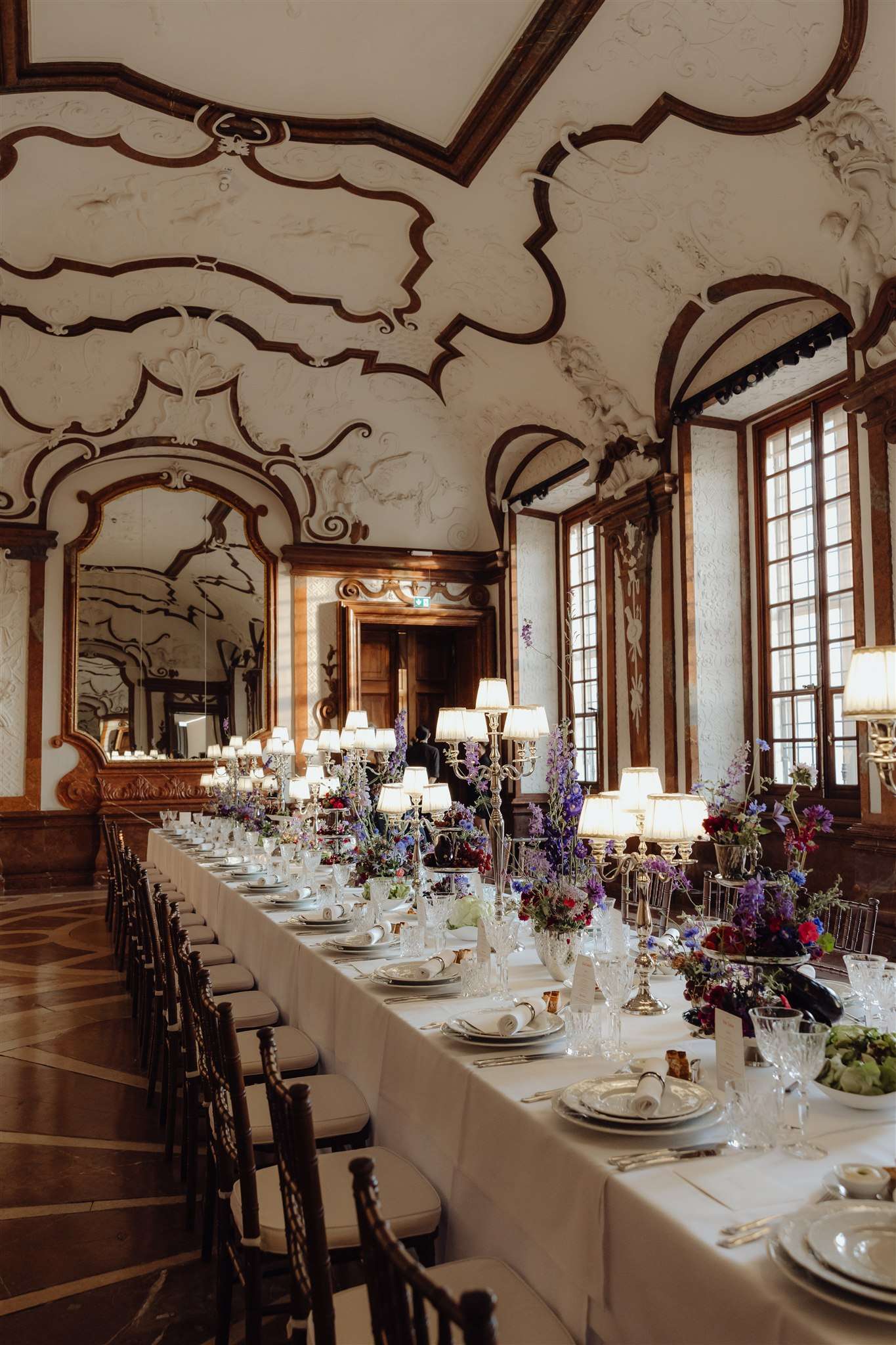 Das barocke Ambiente des Schloss Belvedere in Wien bot den perfekten Rahmen für ein edles und modernes Hochzeitskonzept. Die langen Tafeln wurden mit weißen Tischdecken, eleganten Chiavari-Stühlen und funkelnden Kristallgläsern eingedeckt. Silberne Kandelaber mit sanftem Licht setzten glanzvolle Akzente und sorgten für eine festliche Stimmung.