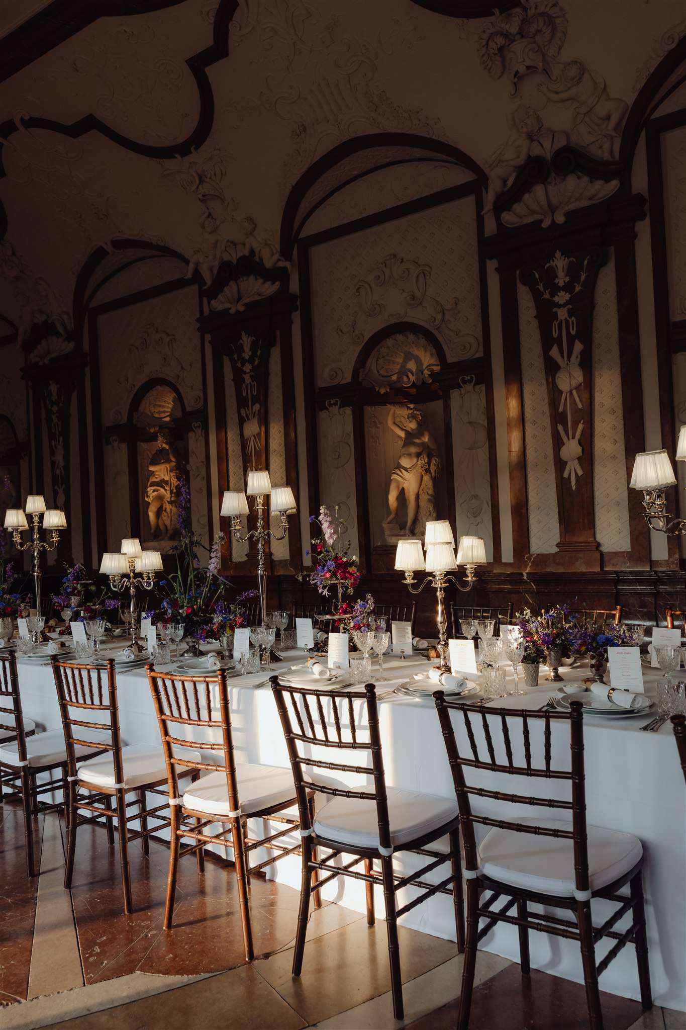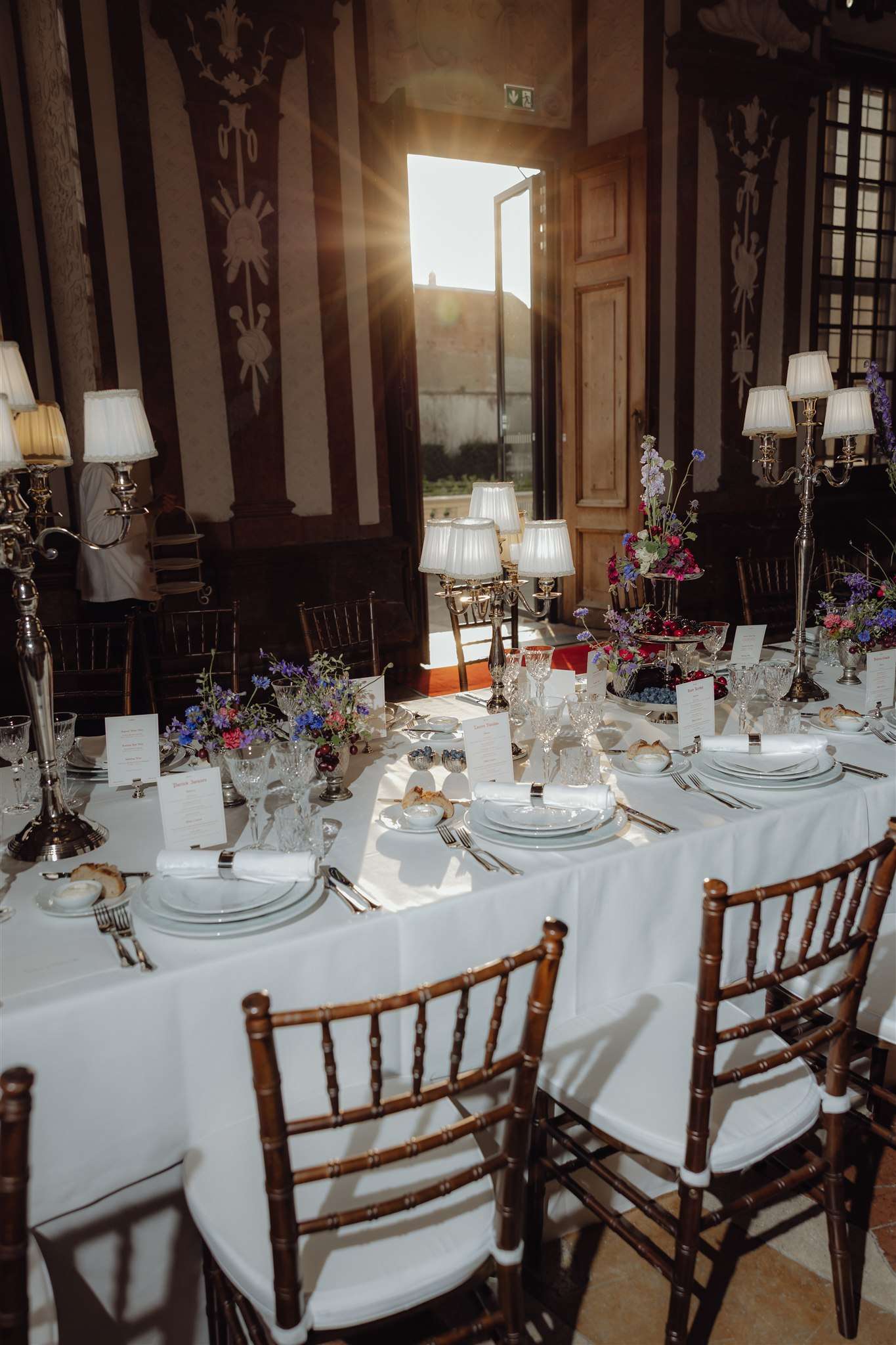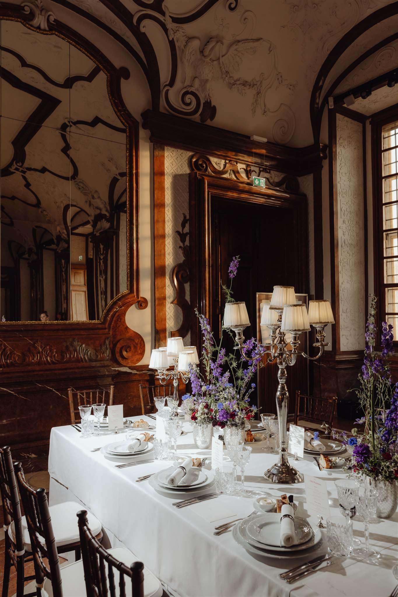 Das barocke Ambiente des Schloss Belvedere in Wien bot den perfekten Rahmen für ein edles und modernes Hochzeitskonzept. Die langen Tafeln wurden mit weißen Tischdecken, eleganten Chiavari-Stühlen und funkelnden Kristallgläsern eingedeckt. Silberne Kandelaber mit sanftem Licht setzten glanzvolle Akzente und sorgten für eine festliche Stimmung.