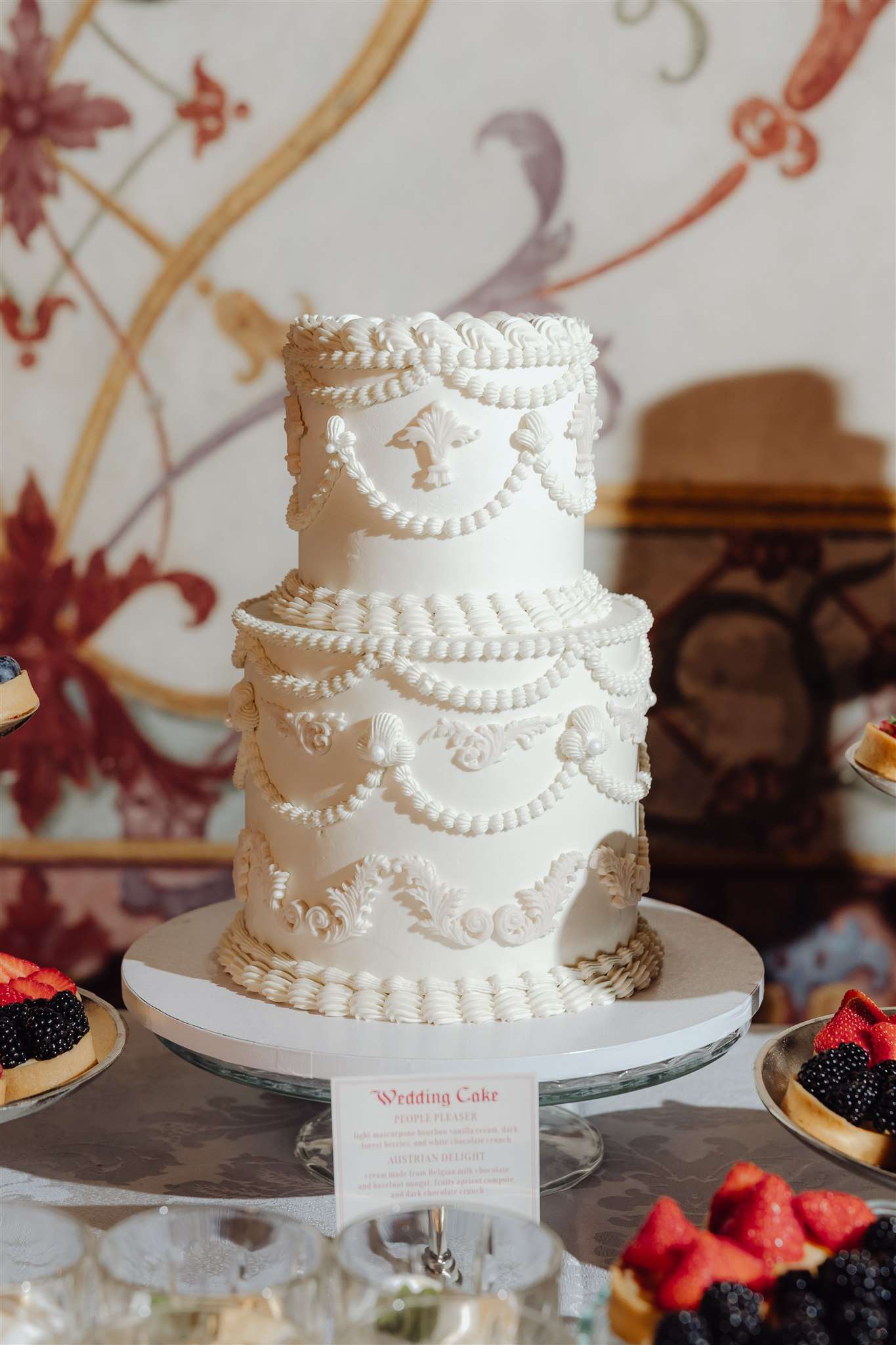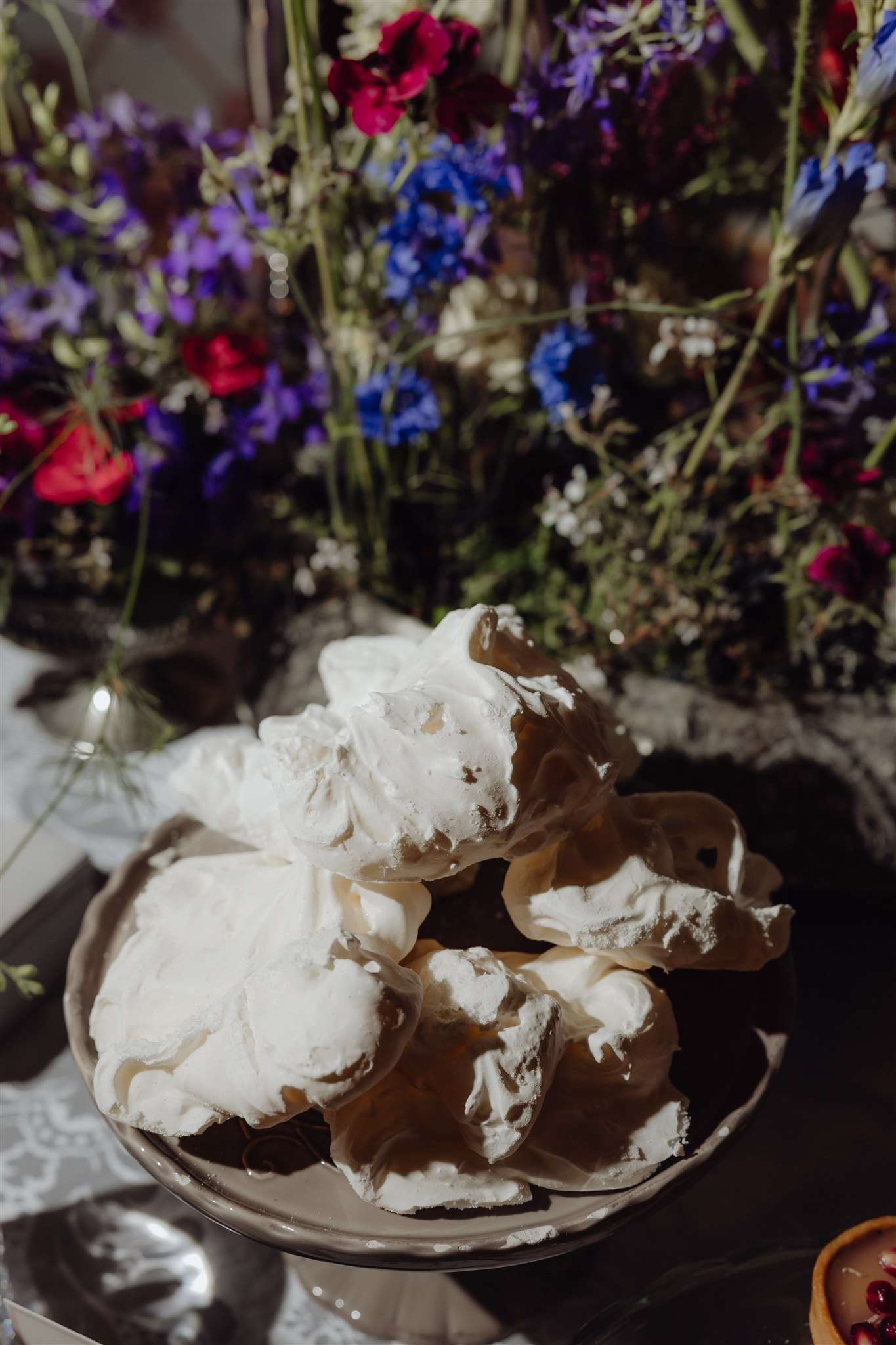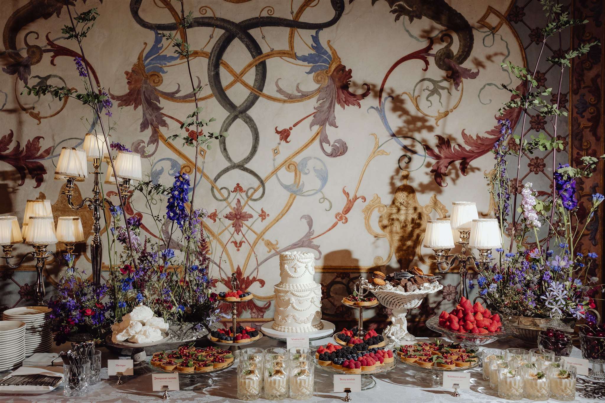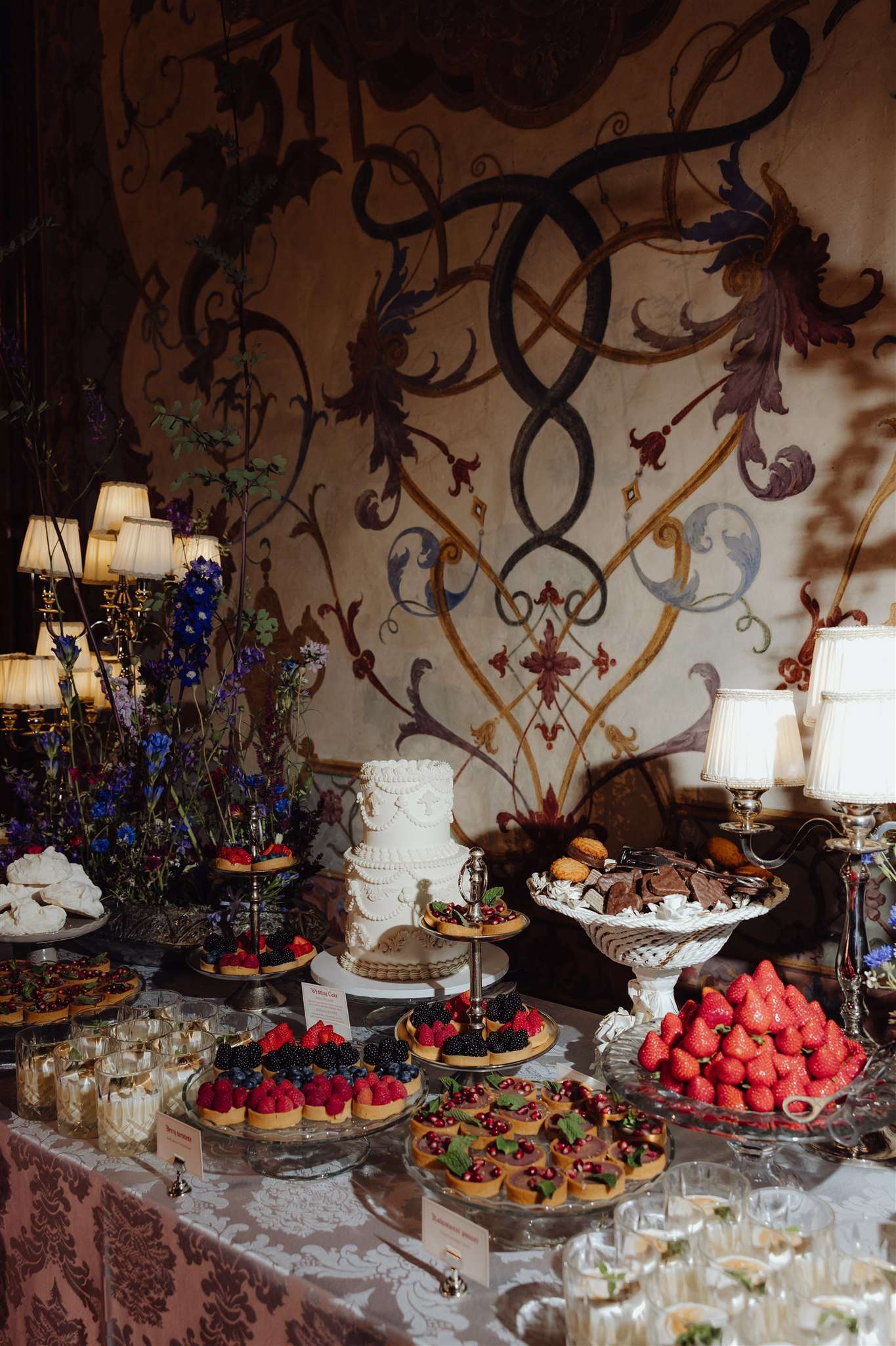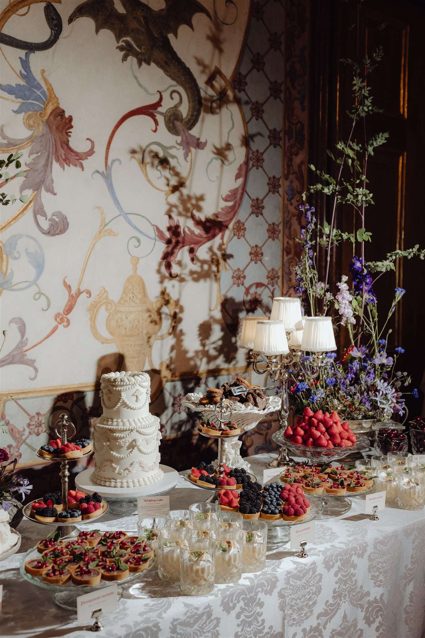 Das Highlight bildete das aufwendig gestaltete Dessertbuffet mit einer kunstvollen weißen Hochzeitstorte und einer Auswahl an süßen Köstlichkeiten, die nicht nur geschmacklich, sondern auch visuell ein Erlebnis waren.