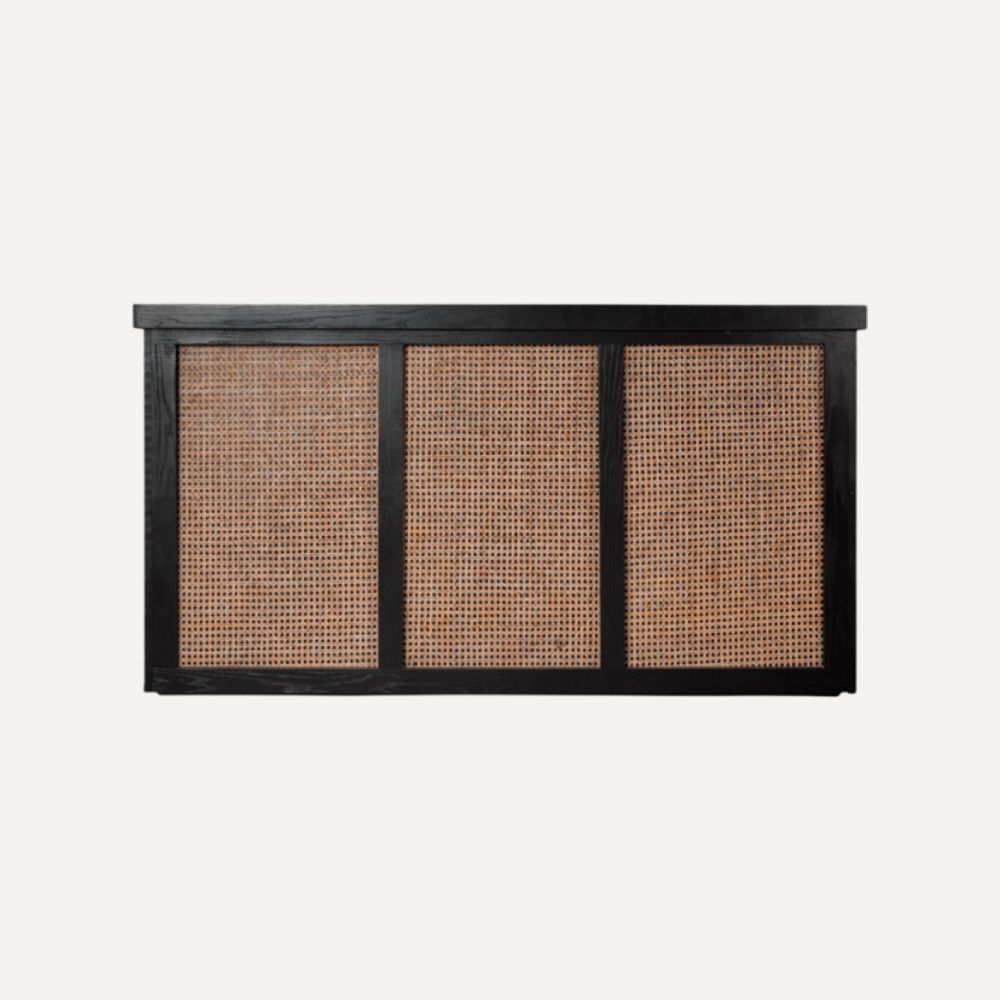 Dank der Kombination aus schwarzem Holz und den warmen Rattanelementen ist diese Bar vielseitig einsetzbar und verleiht jedem Raum eine besondere Note. Sie eignet sich ideal als Getränkestation oder als dekoratives Möbelstück für Empfangsbereiche. Mit ihrer Größe bietet sie ausreichend Platz, um Getränke, Gläser und Accessoires stilvoll zu präsentieren.