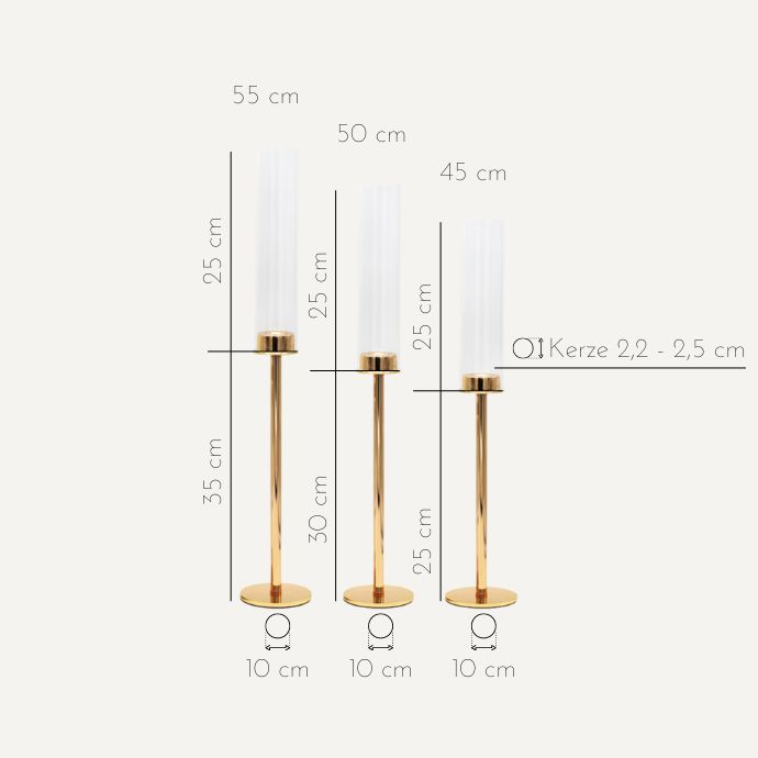 Dieses stilvolle 3-teilige Kerzenhalter-Set bringt einen Hauch von Luxus in deine Dekoration. Mit einem goldfarbenen Finish und schlankem Glasdesign setzen die Kerzenhalter elegante Akzente, ideal für festliche Anlässe und elegante Dinner-Partys. Dank der unterschiedlichen Höhen erzeugen sie eine harmonische Lichtstimmung. Ein Muss für eine zeitlose und minimalistische Dekoration!