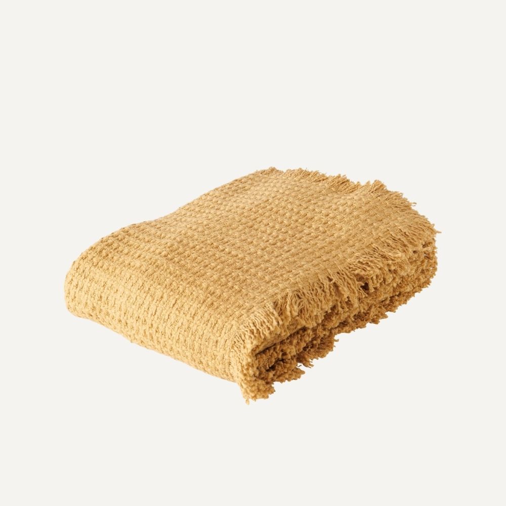 Die Decke Honey Weave überzeugt mit ihrer weichen Waffelstruktur und den lässigen Fransen. In warmem Senfgelb bringt sie Gemütlichkeit und Style auf dein Event – ideal für Sommernächte oder Winter-Lounges.