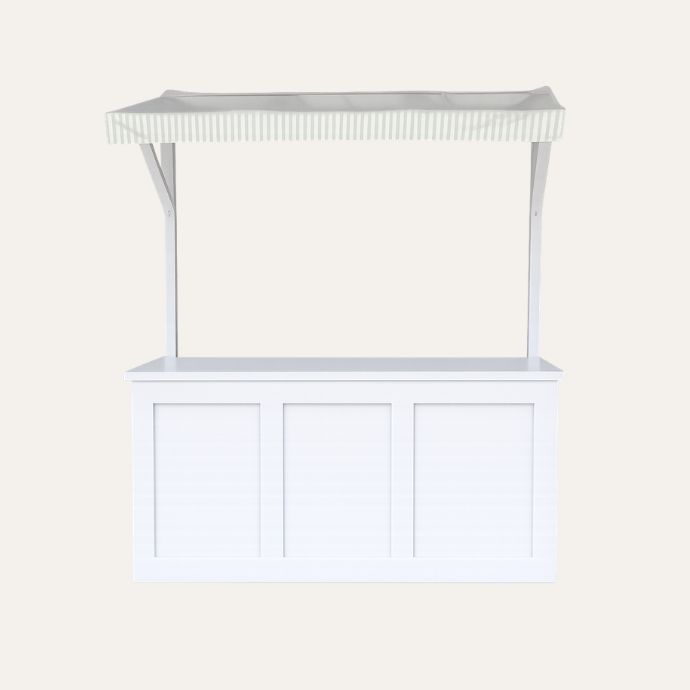 Die Front ist mit eleganten Kassetten gestaltet, die Seiten sind bewusst glatt gehalten und sorgen für eine klare, moderne Optik. Das fein gestreifte Dach verleiht dem Stand einen charmanten, leichten Markt-Look – perfekt für Sommerhochzeiten, Garden Partys, Corporate Events oder exklusive Privatevents.