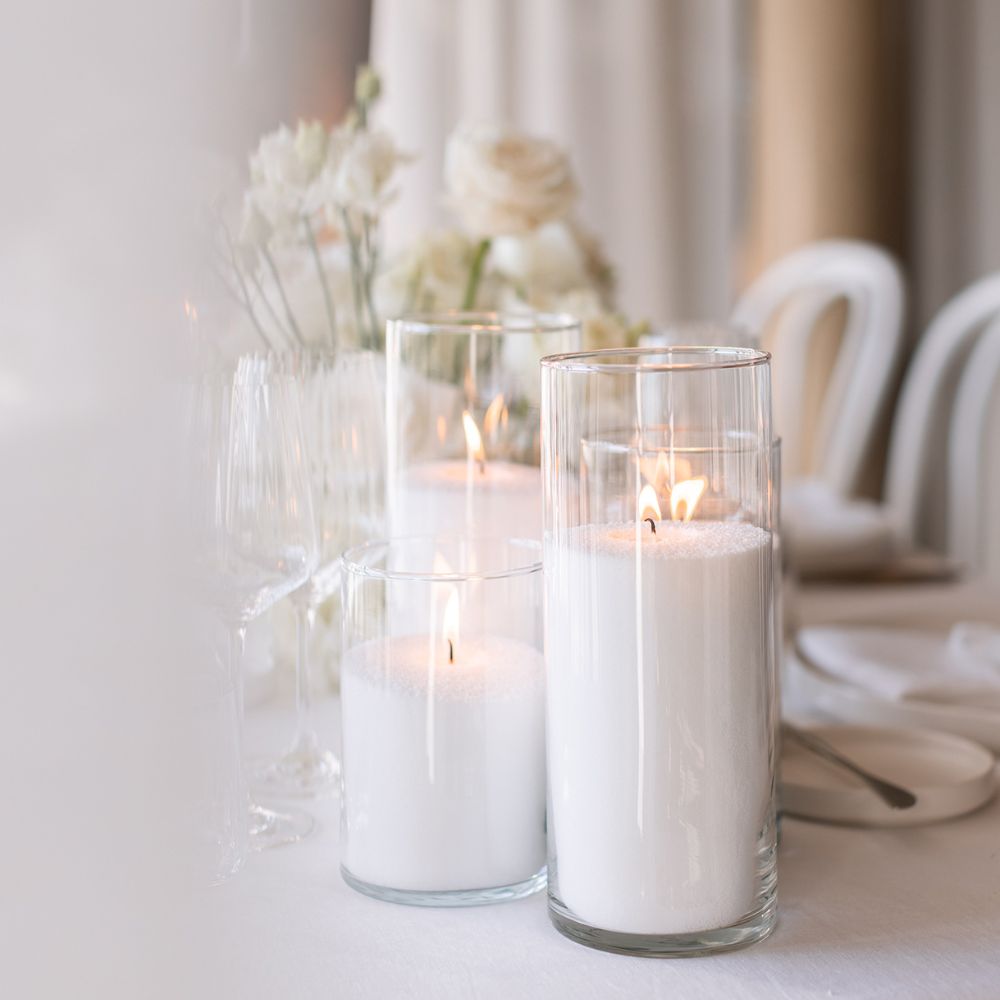 Mit unseren modernen Sandwachs-Kerzen schaffst du im Handumdrehen eine stimmungsvolle Atmosphäre für Hochzeiten und Events. Das feine Kerzenwachs wird einfach in Glasvasen oder andere hitzebeständige Gefäße gefüllt und mit einem Docht versehen – fertig ist eine elegante Kerze. Besonders beliebt sind Sandkerzen aktuell als Top-Trend in Glaszylindern auf Hochzeitstischen.